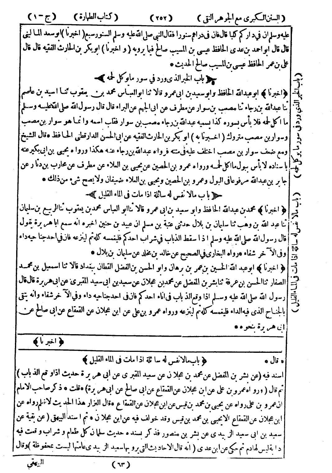 * قال * (باب ما لا نفس له سائلة إذا مات في الماء القليل) اسند فيه (عن بشر بن المفضل عن محمد بن عجلان عن سعيد المقبرى عن ابى هريرة حديث إذا وقع الذباب) ثم قال (ورواه عمرو بن على عن ابن عجلان عن القعقاع عن ابى صالح عن ابى هريرة) * قلت * ذكر صاحب الامام ان عمرو بن على رواه عن يحيى بن محمد بن قيس عن ابن عجلان عن القعقاع * قال البزاز هذا الحديث لا نعلم رواه عن ابن عجلان عن القعقاع الايحيى بن محمد بن قيس وقد خولف فيه عن ابن عجلان * ثم اسند البيهقى (عن بقية عن سعيد بن ابى سعيد الزبيدى عن بشر بن منصور فذكر بسنده حديث سلمان كل طعام وشراب وقعت فيه دابة ليس لهادم ثم حكى عن ابن عدى (انه قال الاحاديث التى يرويها سعيد الزبيدى عامتها ليست بمحفوظة) وقال