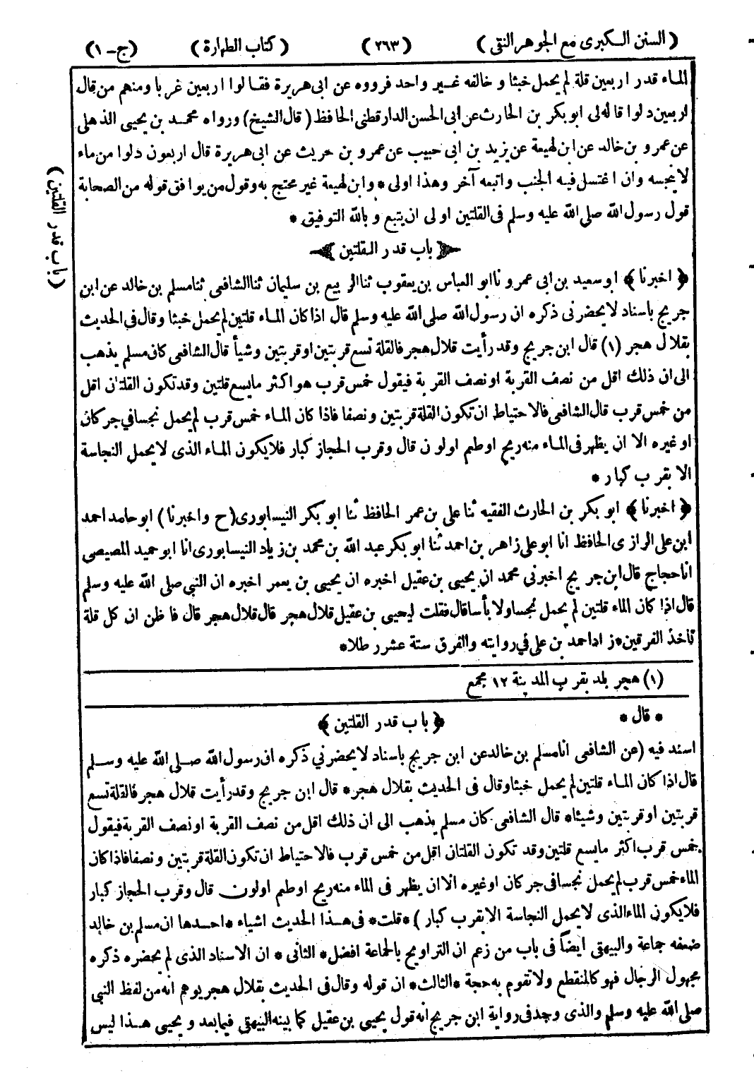 * قال * (باب قدر القلتين) اسند فيه (عن الشافعي انا مسلم بن خالد عن ابن جريج باسناد لا يحضرني ذكره ان رسول الله صلى الله عليه وسلم قال إذا كان قلتين لم يحمل حبثا وقال في الحديث بقلال هجر * قال ابن جريج وقد رأيت قلال هجر فالقلة تسع قربتين أو قربتين وشيئا * قال الشافعي كان مسلم يذهب إلى ان ذلك اقل من نصف القربة أو نصف القربة فيقول خمس قرب اكثر ما يسمع قلتين وقد تكون القلتانى اقل من خمس قرب فالاحتياط ان تكون القلة قربتين ونصفا فإذا كان الماء خمس قرب لم يحمل نجسا في جركان أو غيره الا ان يظهر في الماء منه ريح أو طعم أو لون قال وقرب الحجاز كبار فلا يكون الماء الذى لا يحمل النجاسة الا يقرب كبار) * قلت * في هذا الحديث اشياء * احدها ان مسلم بن خالد ضعفه جماعة والبيهقي ايضا في باب من زعم ان التراويح بالحماعة افضل * الثاني * ان الاسناد الذى لم يحضره ذكره مجهول الرجال فهو كالمنقطع ولا تقوم به حجة * الثالث * ان قوله وقال في الحديث بقلال هجر يوهم انه من لفظ النبي صلى الله عليه وسلم والذى وجد في رواية ابن جريج انه قول يحيى بن عقيل كما بينه البيهقى فيما بعد ويحيى هذا ليس