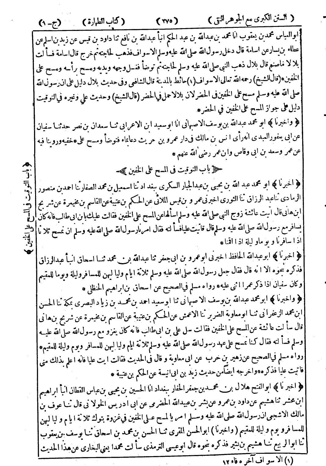 (قال الشيخ) رحمه الله تعالى الاسواف (1) حائط بالمدينة قال الشافعي وفي حديث بلال دليل على ان رسول الله صلى الله عليه وسلم مسح على الخفين في الحضر لان بلالا حمل في الحضر (قال الشيخ) وحديث علي وغيره في التوقيت دليل على جواز المسح على الخفين في الحضر.
