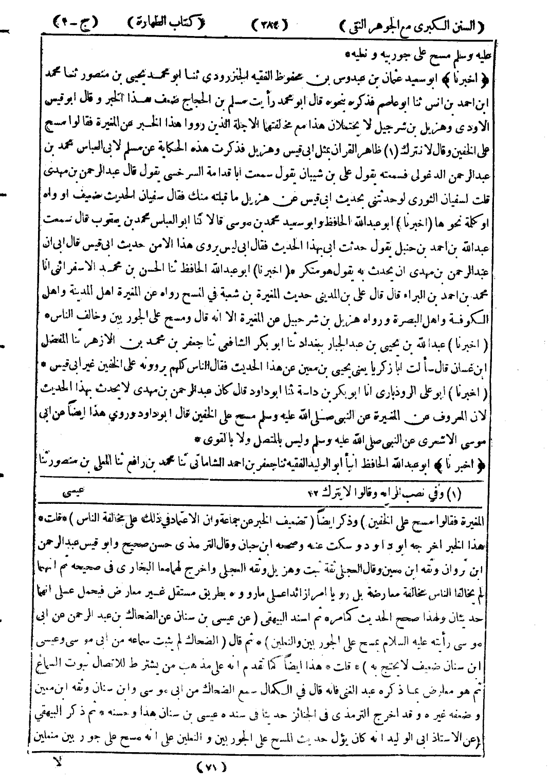 المغيرة * فقالوا مسح على الخفين) وذكر ايضا (تضعيف الخبر عن جماعة وان الاعتماد في ذلك على مخالفة الناس) * قلت * هذا الخبر اخرجه أبو داود سكت عنه وصححه ابن حبان وقال الترمذي حسن صحيح وابو قيس عبد الرحمن ابن ثروان وثقه ابن معين وقال العجلى ثقة ثبت وهزيل وثقه العجلى واخرج لهما معا البخاري في صحيحه ثم انهما لم يخالفا الناس مخالفة معارضة بل رويا امر زائدة على ما ورده بطريق مستقل غير معارض فيحمل على انهما حديثان ولهذا صحح الحديث كما مره * ثم اسند البيهقى (عن عيسى بن سنان عن الضحاك بن عبد الرحمن عن ابى موسى رأيته عليه السلام يمسح على الجروبين النعلين) * ثم قال (الضحاك لم يثبت سماعه من ابى موسى وعيسى ابن سنان ضعيف لا يحتج به) * قلت * هذا ايضا كما تقدم انه على مذهب من يشترط للاتصال ثبوت السماع ثم هو معارض بما ذكره عبد الغنى فان هقال في الكمال سمع الضحاك من ابى موسى وابن سنان وثقه ابن معين وضعفه غيره وقد اخرج الترمذي في الجنائز حديثا في سنده عيسى بن سنان هذا وحسنه * ثم ذكر البيهقى (عن الاسناد ابى الوليد انه كان يؤل حديث المسح على الجوربين والنعلين على انه مسح على جور بين منعلين