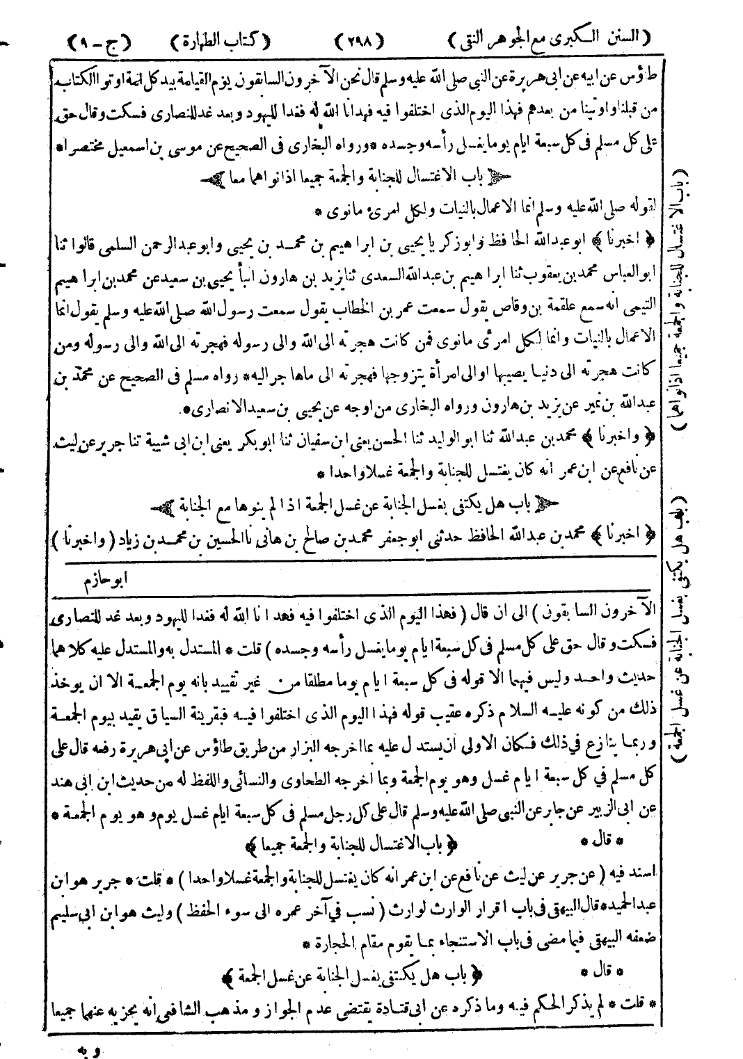 الآخرون السابقون) إلى ان قال (فهذا اليوم الذى اختلفوا فيه فهدانا الله له فغدا لليهود وبعد غد للنصارى فسكت وقال حتى على كل مسلم في كل سبعة ايام يوما يغسل رأسه وجسده) * قلت * المستدل به والمستدل عليه كلاهما حديث واحسد وليس فيهما الا قوله في كل سبعة ايام يوما مطلقا من غير تقييد بانه يوم الجمعة الا ان يوخذ ذلك من كونه عليه السلام ذكر عقيب قوله فهذا اليوم الذى اختلفوا فيه فيقرينة السياق يقيد بيوم الجمعة وربما ينازع في ذلك فكان الاولى ان يستدل عليه بما اخرجه البزار من طريق ماؤس عن ابى هريرة رفعه قال على كل مسلم في كل سبعة ايام غسل وهو يوم الجمعة وبما اخرجه الطحارى والنسائي واللفظ له من حديث ابن ابى هند عن ابى الزبير عن جابر النبي صلى الله عليه وسلم قال على كل رجل مسلم في سبعة ايام غسل يوم وهو يوم الجمعة * * قال * (باب الاغتسال للجنابة والجمة جميعا) اسند فيه (عن جرير عن ليث عن نافع عن ابن عمرانه كان يغتسل للجنابة والجمعة غسلا واحدا) * قلت * جرير هو ابن عبد الحميد هـ قال البيهقى في باب اقرار الوارث لوارث (نسب في آخر عمر هـ إلى سوء الحفظ) وليث هو ابن ابى سليم ضعفه البيهقى فيما مضى في باب الاستنجاء بما يقوم مقام الحجارة * * قال * (باب هل يكتفى يغسل الجنابة عن غسل الجمعة) * قلت * لم يذكر الحكم فيه وما ذكره عن ابى قتادة يقتضى عدم الجواز ومذهب الشافعي انه يجزيه عنهما جميعا