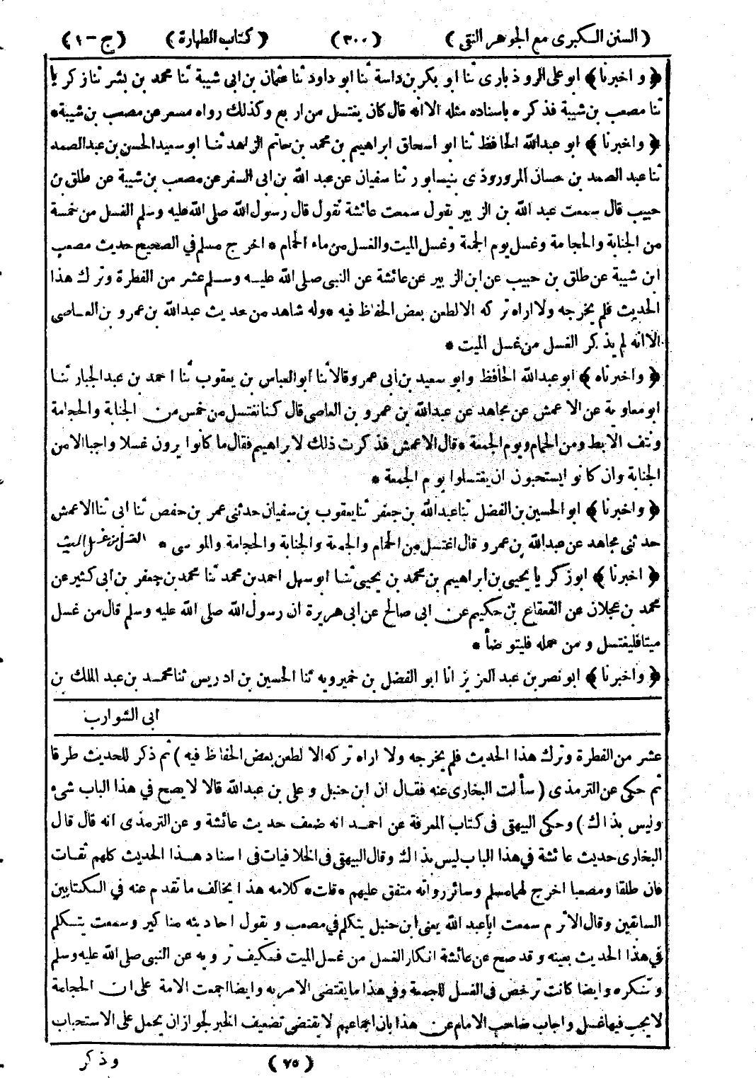 عشر من الفطرة وترك هذا الحدث فلم يخرجه ولا اراه تركه الا لطعن بعض الحفاظ فيه) ثم ذكر للحديث طرقا ثم حكى عن الترمذي (سألت البخاري عنه فقال انا بن حنبل وعلى بن عبد الله قالا لا يصح في هذا الباب شئ وليس بذاك) وحكى البيهقى في كتاب المعرفة عن احمد انه ضعف حديث عائشة وعن الترمذي انه قال قال البخاري حديث عائشة في هذا الباب ليس بذاك وقال البيهقى الخلافيات في اسناد هذا الحديث كلهم ثقات فان طلقا ومصعبا اخرج لهما مسلم وسائر رواته متفق عليهم * قلت * كلام هذا يخالف ما تقدم عنه في الكتابين السابقين وقال الاثرم سمعت ابا عبد الله يعنى ابن حنبل يتكلم في مصعب ويقول احاديثه مناكير وسمعت يتكلم في هذا الحديث بعينه وقد صح عن عائشة انكار الغسل عن غسل الميت فكيف ترويه عن النبي صلى الله عليه وسلم وتنكره وايضا كانت ترخص في الغسل للجمعة وفي هذا ما يقتضى الامر به وايضا اجمعت الامة على ان الحجامة لا يجب فيها غسل واجاب صاحب الامام عن هذا بان اجماعهم لا يقتضى تضعيف الخبر الجوازان يحمل على الاستحباب