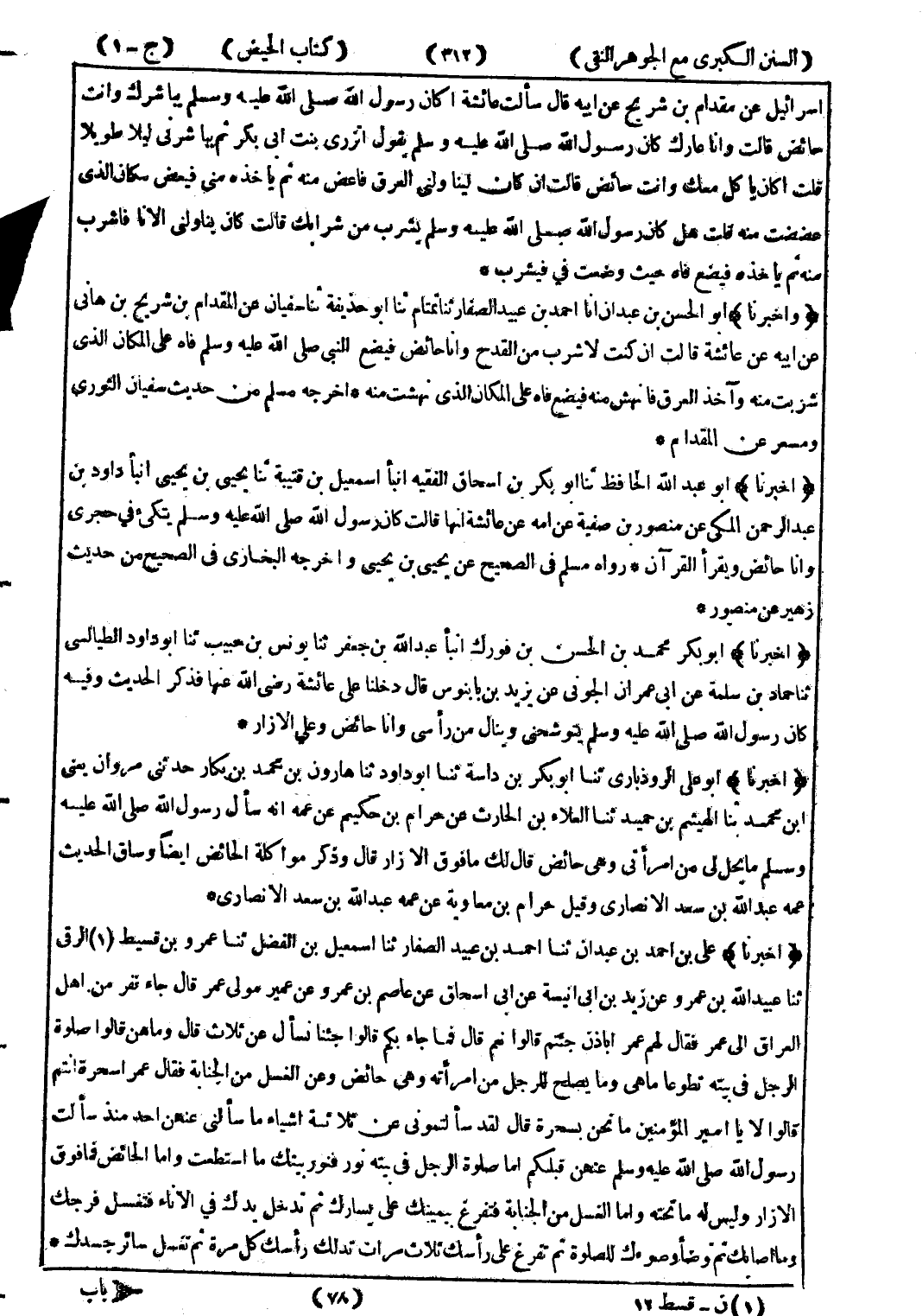 (وأخبرنا) أبو الحسن بن عبدان انا أحمد بن عبيد الصفار ثنا تمتام ثنا أبو حذيفة ثنا سفيان عن المقدام بن شريح بن هاني عن أبيه عن عائشة قالت ان كنت لاشرب من القدح وأنا حائض فيضع النبي صلى الله عليه وسلم فاه على المكان الذي شربت منه وآخذ العرق فانهش منه فيضع فاه على المكان الذي نهشت منه.