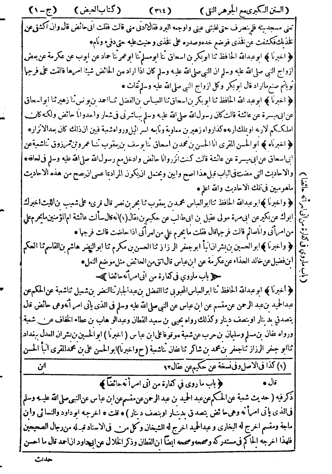 * قال * (باب ماروى في كفارة من اتى امرأته حائضا) ذكر فيه (حديث شعبة عن الحكم عن عبد الحميد بن عبد الرحمن عن مقسم عن ابن عباس عن النبي صلى الله عليه وسلم في الذى ياتي امرأته وهى حائض يتصدق بدينار أو بنصف دينار) * قلت * اخرجه أبو داود والنسائي وابن ماجة ومقسم اخرج له البخاري وعبد الحميد اخرج له الشيخان وكل من الاسناد قبله من رجال الصحيحين فلهذا اخرجه الحاكم في مستدركه وصححه وصححه ايضا ابن القطان وذكر الخلال عن ابى داود ان احمد قال ما احسن