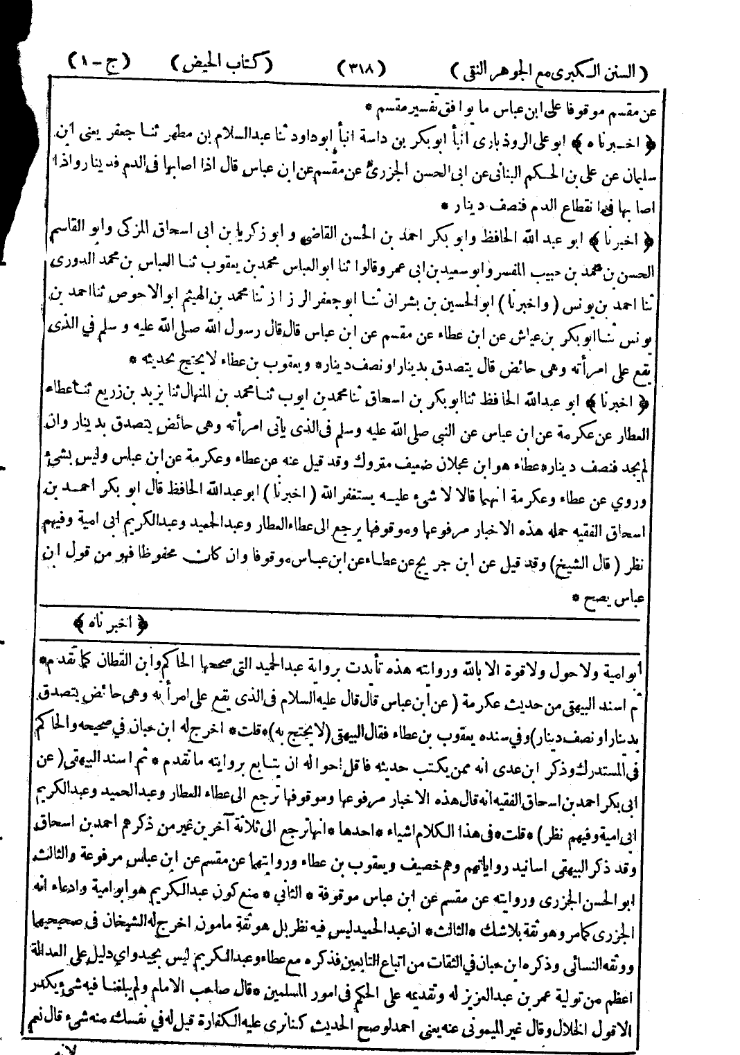 أبو امية ولا حول ولا قوة الا بالله وروايته هذه تايدت بروية عبد الحميد التى صححها الحاكم وابن القطان كما تقدم * ثن اسند البيهقى من حديث عكرمة (عن ابن عباس قال قال عليه السلام في الذى يقع على امرأته وهى حائض يتصدق بدينار أو نصف دينار) وفي سنده يعقوب بن عطاء فقال البيهقى (لا يحتج به) * قلت * اخرج له ابن حبان في صحيحه والحاكم في المستدرك وذكر ابن عدى انه ممن يكتب حديثه فاقل احواله ان يتابع بروايته ما تقدم * ثم اسند البيهقى (عن ابى بكر احمد بن اسحاق الفقيه انه قال هذه الاخبار مرفوعها وموقوفها ترجع إلى عطاء العطار وعبد العحميد وعبد الكريم ابى امية وفيهم نظر) * قلت * في هذا الكلام اشياء * احدها * انها ترجع إلى ثلاثة آخرين غير من ذكرهم احمد بن اسحاق وقد ذكر البيهقى اسانيد رواياتهم وهم خصيف ويعقوب بن عطاء وروايتهما عن مقسم عن ابن عباس مرفوعة والثالث أبو الحسن الجزرى وروايته عن مقسم عن ابن عباس موقوفه * الثاني * منع كون عبد الكريم هو أبو امية وادعاؤ اه الجزرى كما مر وهو ثقة بلاشك * الثالث * ان عبد الحميد ليس فيه نظر بل هو ثقة مامون اخرج له الشيخان في صحيحهما ووثقه النسائي وذكره ابن حبان في الثقات من اتباع التابعين فذكره مع عطاءو عبد الكريم ليس يجيدواى دليل على العدالة اعظم من تولية عمر بن عبد العزيز وتقديمه على الحكم في امور المسلمين * قال صاحب الامام ولم يبلغنا فيه شئ يكدر الاقول الخلال وقال غير الميمونى عنه يعنى احمد لو صح الحديث كنا نرى عليه الكفارة قيل له في نفسك منه شئ قال نعم