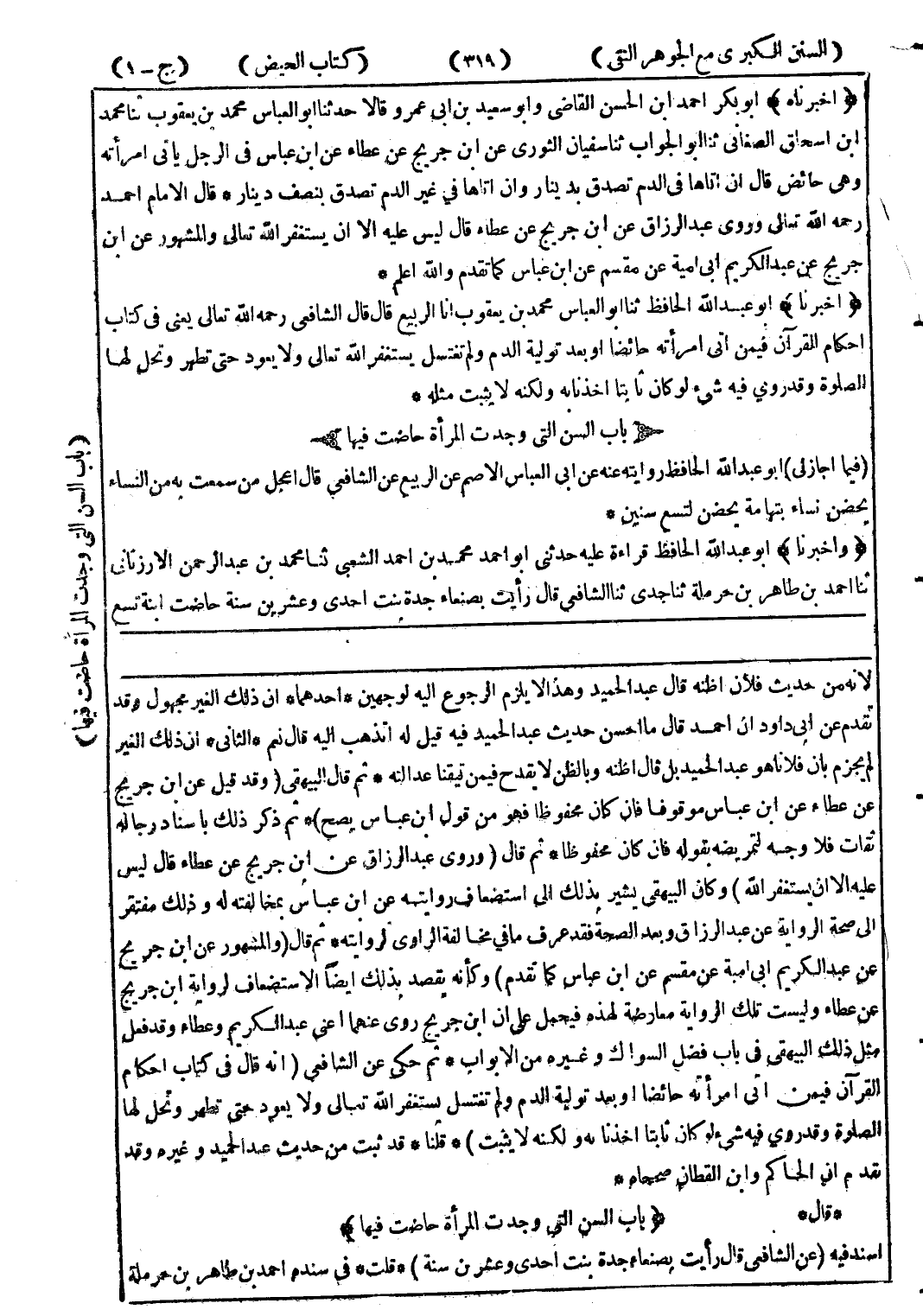 تقدم عن ابى داود ان احمد قال ما احسن حديث عبد الحميد فيه قيل له اتذهب إليه قال نعم * الثاني * ان ذلك الغير لم يجزم بان فلانا هو عبد الحميد بل قال اظنه بالظن لا يقدم فيمن تيقنا عدالته * ثم قال البيهقى (وقد قيل عن ابن جريج عن عطاء عن ابن عباس موقوفا فان كان محفوظا فهو من قول ابن عباس يصح) * ثم ذكر ذلك باسناد رجاله ثقات فلا وجه لتمريضه بقوله فاه كان محفوظا * ثم قال (وروى عبد الرزاق عن ابن جريج عن عطاء قال ليس عليه الا ان يستغفر الله) وكان البيهقى يشير بذلك إلى استضعاف روايته عن ابن عباس بمخالفته له وذلك مفتقر إلى صحة الرواية عن عبد الرزاق وبعد الصحة فقد عرف ما في مخالفة الراوى لروايته * ثم قال (والمشهور عن ابن جريج عن عبد الكريم ابى امية عن مقسم عن ابن عباس كما تقدم) وكأنه يقصد بذلك ايضا الاستضعاف لرواية ابن جريج عن عطاء وليست تلك الرواية معارضإ لهذه فيحمل على ان ابن جريج روى عنهما اعني عبد الكريم وعطاء وقد فعل مثل ذلك البيهقى في باب فضل السواك وغيره من الابواب * ثم حكى عن الشافعي (انه قال في كتاب احكام القرآن فيمن اتى امرأته حائضا أو بعد تولية الدم ولم تغتسل يستغفر الله تعالى ولا يعود حتى تطهر وتحل لها الصلوة وقد روي فيه شئ لو كان ثابتا اخذنا له ولكنه لاثبت) * قلنا * قد ثبت من حديث عبد الحميد وغيره وقد تقدم انى الحاكم وابن القطان صحيحاه * * قال * (باب السنن التى وجدت المرأة حاضت فيا) اسند فيه (عن الشافعي قال رأيت بصنعاء جدة بنت احدى وعشرين سنة) * قلت * في سنده احمد بن طاهر بن حمر ملة