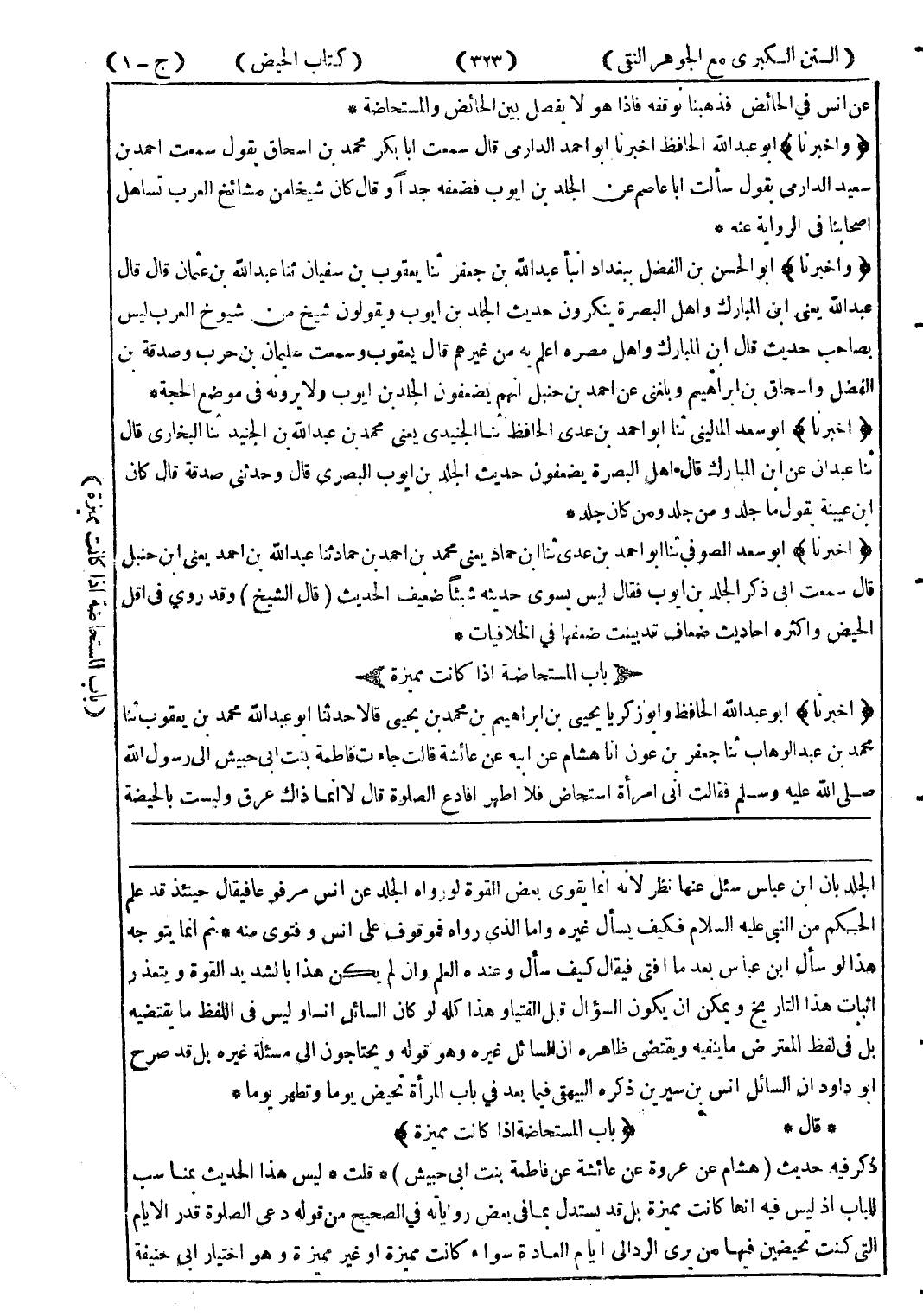 الجلد بان ابن عباس سئل عنها نظر لانه انما يقوى بعض القوة لورواه الجلد عن انس مرفوعا فيقال حينئذ قد علم الحكم من النبي صلى الله عليه وسلم فكيف يسأل غيره واما الذى رواه فموقوف على انس وفتوى منه * ثم انما يتوجه هذا لو سأل ابن عباس بعد ما افتى فيقال كيف سأل وعنده العلم وان لم يكن هذا بالشديد القوة ويتعذر اثبات هذا التاريخ ويمكن ان يكون السؤال قبل الفتيا وهذا كله لو كان السائل انسا وليس في اللفظ ما يقتضيه بل في لفظ المعترض ما ينفيه ويقتضى ظاهره ان المسائل غيره وهو قوله ويحتاجون إلى مسألة غيره بل قد صرح أبو داود ان السائل انس بن سيرين ذكره البيهقى فيما بعد في باب المرأة تحيض يوما وتطهر يوما * * قال * (باب المستحاضة إذا كانت مميزة) ذكر فيه حديث (هشام بن عروة عن عائشة عن فاطمة بنت ابى حبيش) * قلت * ليس هذا الحديث بمناسب للباب إذ ليس فيه انها كانت مميزة بل قد يستدل بما في بعض رواياته في الصحيح من قوله عى الصلوة قدر الايام التى كنت تحيضين فيها من يرى الرد الى ايام العادة سواء كانت مميزة أو غير مميزة وهو اختيار ابى حنيفة