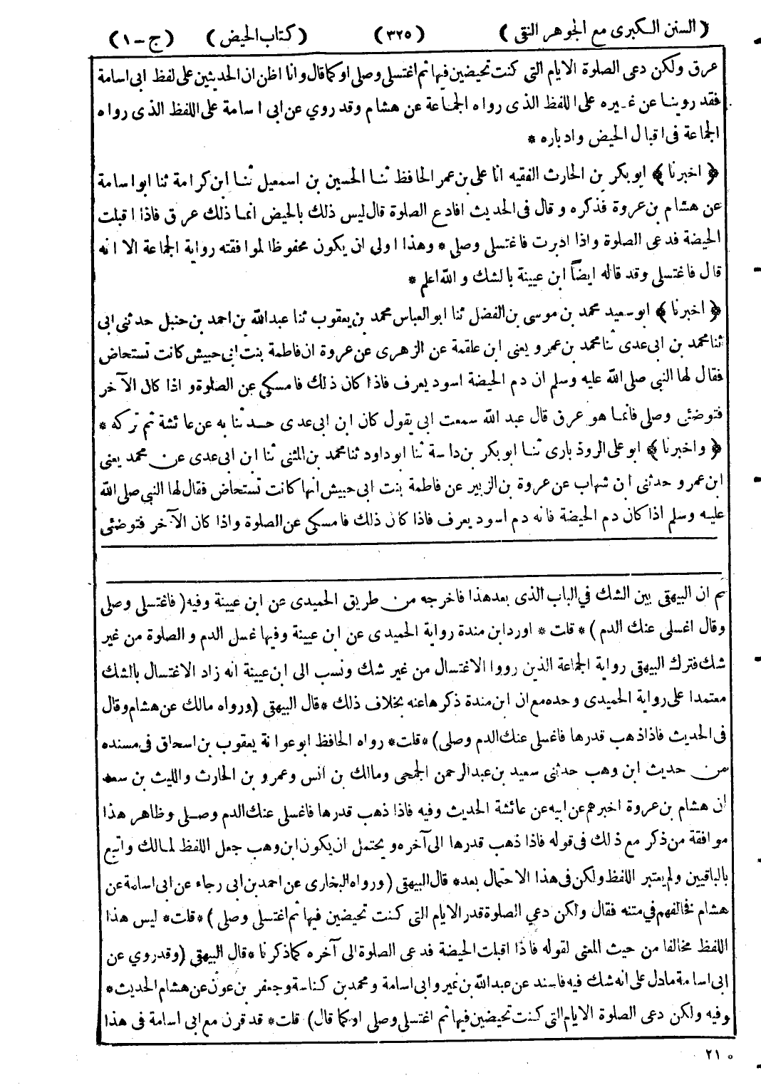 ثم ان البيهقى بين الشك في الباب الذى دعهذا فاخرجه من طريق الحميدى عن ابن عيينة وفيه (فاغتسلي وصلى وقال اغسلي عنك الدم) * قلت * اورد ابن مندة رواية الحميدى عن ابن عيينة وفيها غسل الدم والصلوة من غير شك فترك البيهقى رواية الجماعة الذين رووا الاغتسال من غير شك ونسب إلى ابن عيينة انه زاد الاغتسال بالشك معتمدا على رواية الحميدى وحده مع ان ابن مندة ذكرها عنه بخلاف ذلك * قال البيهقى (ورواه مالك عن هشام وقال في الحديث فإذا ذهب قدرها فاغسلي عنك الدم وصلى) * قلت * رواه الحافظ أبو عوانة يعقوب بن اسحاق في مسنده من حديث ابن وهب حدثنى سعيد بن عبد الرحمن الجمحى ومالك بن انس وعمرو بن الحارث والليث بن سعد ان هشام بن عروة اخبرهم عن ابيه عن عائشة الحديث وفيه فإذا ذهب قدرها فاغسلي عنك الدم وصلى وظاهر هذا موافقة من ذكر مع ذلك في قوله فإذا ذهب قدرها إلى آخره ويحتمل ان يكون ابن وهب اللفظ لمالك واتبع بالباقيين ولم يعتبر اللفظ ولكن في هذا الاحتمال بعد * قال البيهقى (ورواه البخاري عن احمد بن ابى رجاء عن ابى اسامة عن هشام فخالفهم في متنه فقال ولكن دعي الصلوة قد الايام التى كنت تحيضين فيها ثم اغتسلي وصلى) * قلت * ليس هذا اللفظ مخالفا من حيث المعنى لقوله فإذا اقبلت الحيضة فدعى الصلوة إلى آخره كما ذكرنا * قال البيهقى (وقد روي عن ابى اسامة مادل على انه شك فيه فاسند عن عبد الله بن نمير وابي اسامة ومحمد بن كناسة وجعفر بن عون عن هشام الحديث * وفيه ولكن دعى الصلوة الايام التى كنت تحيضين فيها ثم اغتسلي وصل أو كما قال) * قلت * قد قرن مع ابى اسامة في هذا