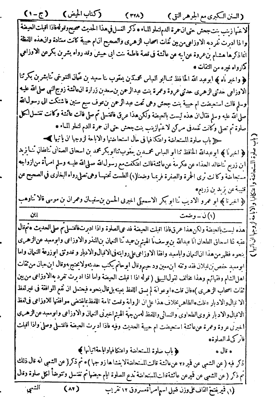 هذه ليست بالحيضة ولكن هذا عرق فإذا اقبلت الحيضة فدعى الصلوة وإذا ادبرت فاغتسلي ثم صلى الحديث ثم قال عقبه ثنا اسحاق الطحان انا عبد الله بن يوسف نا الهيثم بن حميد ثنا النعمان بن المنذر والاوزاعي وابو معبد عن الزهري بنحوه فظهر من هذا ان النعمان وابا معبد وافقا الاوزاعي على روايته في الاقبال والادبار وقد وثق أبو زرعة النعمان واما أبو معبد حفص به غيلان فقد وثقه ابن معين ودحيم وقال أبو حاتم يكتب حديثه ولا يحتج به وقال ابن حبان من ثقات اهل الشام وفقهائهم وهذا مخالف لقول البيهقى (قوله إذا اقبلت الحيضة واما إذا ادبرت تفرد به الاوزاعي من بين ثقات اصحاب الزهري) * فان قلت * أبو عوانة لم يسق اللفظ بعينه بل قال بنحوه فيحتمل ان تقع الموافقة في غير لفظ الاقبال والادبار * قلت * الظاهر بخلاف هذا بخلاف هذا على ان الرواية وقعت تامة اللفظ بما يقتضى موافقتها للاوزاعي في لفظ الاقبال والادبار فروى الطحاوي والنسائي واللفظ له من جهة الهيثم اخبرني النعمان والاوزاعي وابو معبر عن الزهري اخبرني عروة وعمرة عن عائشة استحيضت ام حبيبة الحديث وفيه فإذا اديرت الحيضة فاغتسلي وصلى وإذا اقبلت فاتركي لها الصلوة * * قال * (باب صلوة المستحاضة واعتكافها واباحة ايتانها) ذكر فيه (عن الشعبى عن قمير " 2 عن عائشة قالت المستحاضة لا يغشاها زوجها) * ثم ذكر (عن الشعبى انه قال ذلك ثم ذكر (عن الشعبى عن قمير عن عائشة قالت المستحاضة تدع الصلوة ايام حيضها ثم تغتسل وتتوضأ لكل صلوة وقال