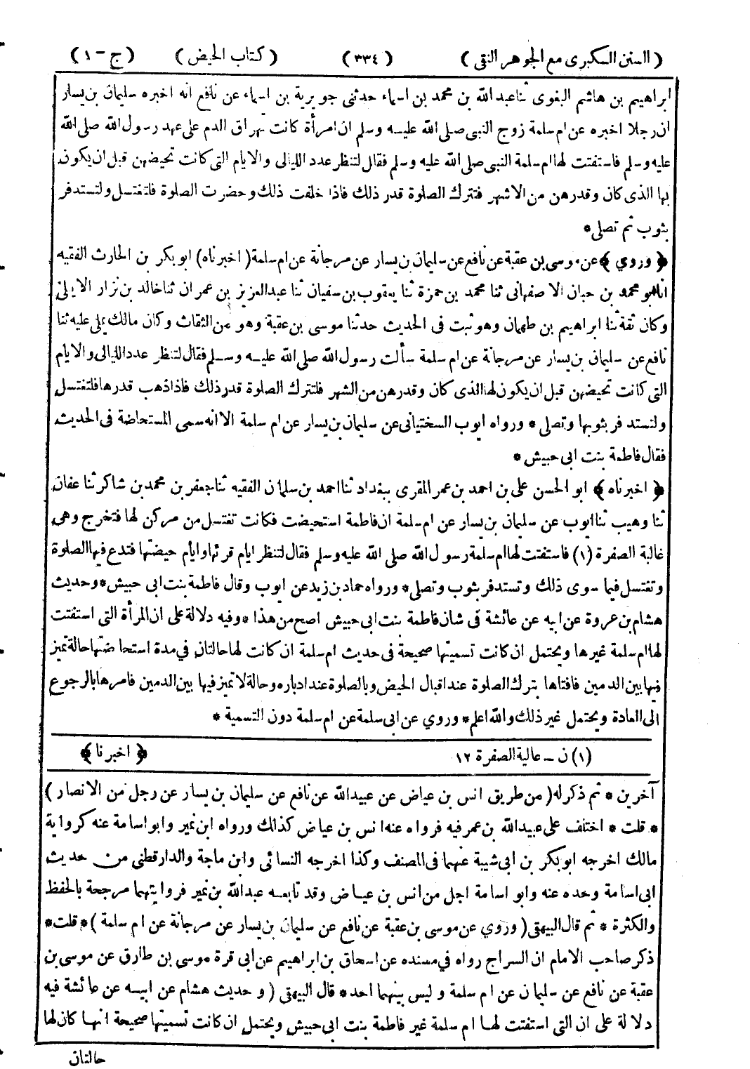 آخرين * ثم ذكر له (من طريق انس بن عياض عن عبيد الله عن نافع عن سليمان بن يسار عن رجل من الانصار) * قلت * اختلف على عبيد الله بن عمر فيه فرواه عنه انس بن عياض كذلك ورواه ابن نمير وابو اسامة عنه كراوية مالك اخرجه أبو بكر بن ابى شيبة عنهما في المصنف وكذا اخرجه النسائي وابن ماجة والدارقطني من حديث ابى اسامة وحده عنه أبو اسامة اجل من انس بن عياض وقد تابعه عبد الله بن نمير فروايتهما مرحجة بالحفظ والكثرة * ثم قال البيهقى (وروي عن موسى بن عقبة عن نافع عن سليمان بن يسار عن مرجانة عن ام سلمة) * قلت * ذكر صاحب الامام ان السراج رواه في مسنده عن اسحاق بن ابراهيم عن ابى قرة موسى بن طارق عن موسى بن عقبة عن نافع عن سليمان عن ام سلمة وليس بينهما احد * قال البيهقى (وحديث هشام عن ابيه عن عائشة فيه دلالة على ان التى استفتت لها ام سلمة غير فاطمة بنت ابى حبيش ويحتمل ان كانت تسميتها صحيحة انها كان لها