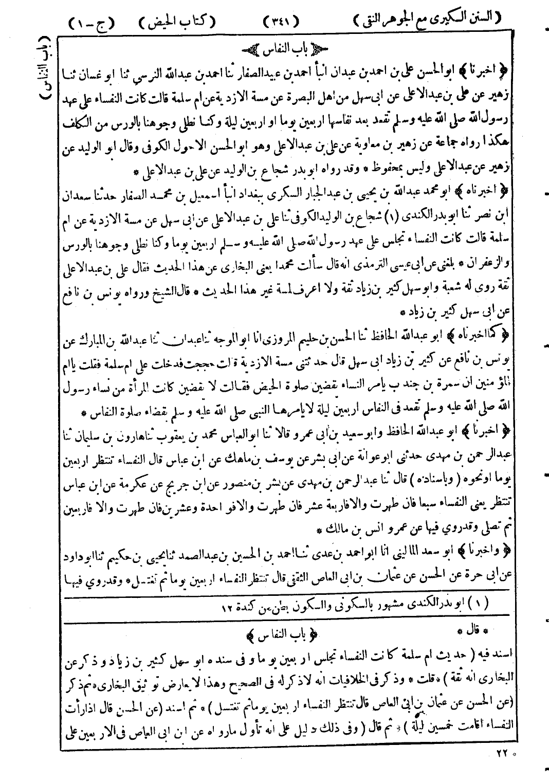 * قال * (باب التفاس) اسند فيه (حديث ام سلمة كانت النفساء تجلس اربعين يوما وفى سنده أبو سهل كثير بن زياد وذكر عن البخاري انه ثقة) * قلت * وذكر في الخلافيات انه لا ذكر له في الصحيح وهذا لا يعارض توثيق البخاري * ثم ذكر