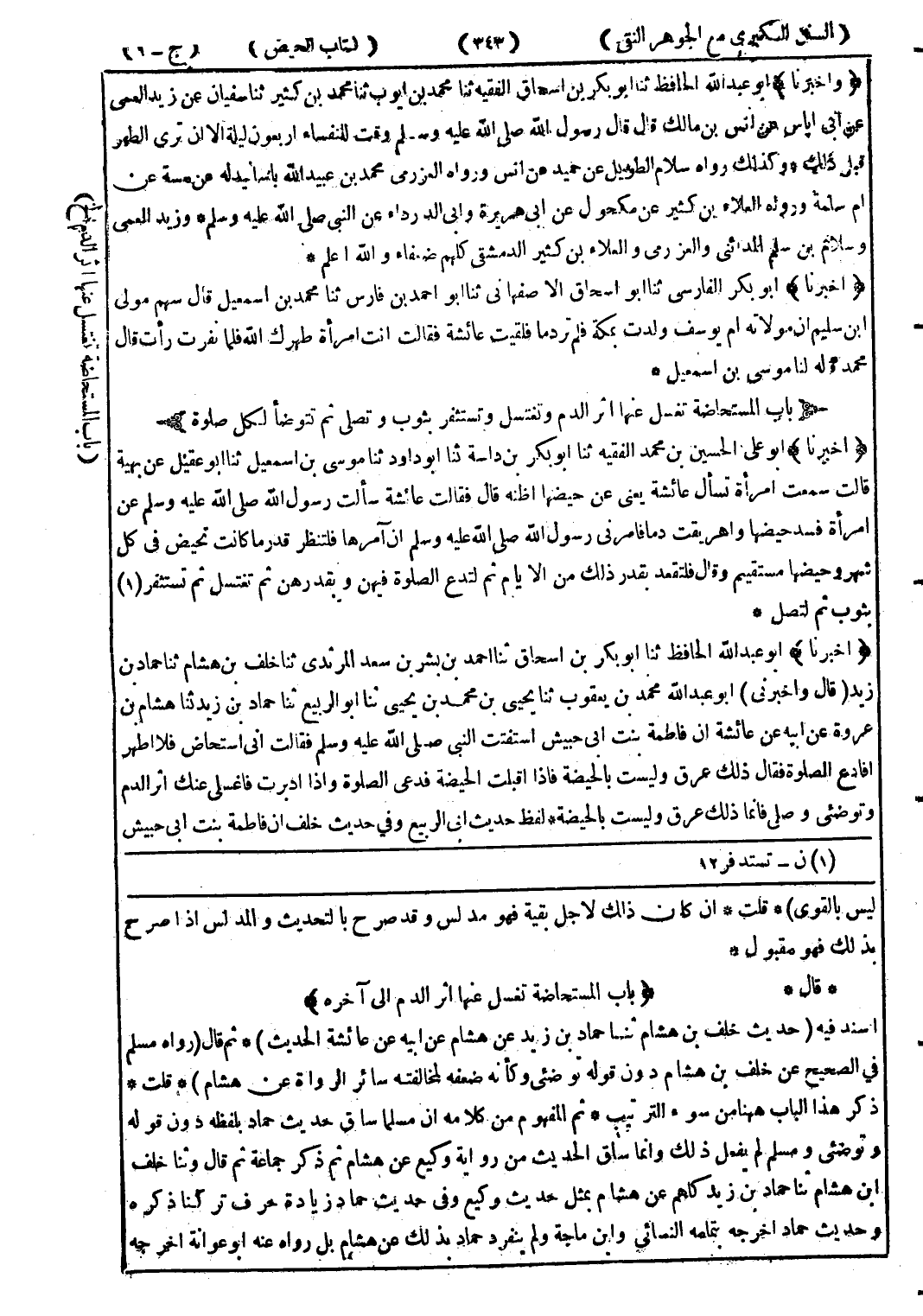 ليس بالقوى) * قلت * ان كان ذلك لاجل مدلس فهو ملدس وقد صرح بالتحديث والمدلس إذ اصرح بذلك فهو مقبول * * قال * (باب المستحاضة تغسل عنها اثر الدم إلى آخر) اسند فيه (حديث خلف بن هشام ثنا حماد بن زيد عن هشام عن ابيه عن عائشة الحديث) * ثم قال (رواه مسلم في الصحيح عن خلف بن هشام دون قوله توضئ وكأنه ضعفه لمخالفته سائر الرواة عن هشام) * قلت * ذكر هذا الباب ههنا من سوء الترتيب * ثم المفهوم من كلامه انمسلما ساق حديث حماد بلفظه دون قوله وتوضئ ومسلم لم يفعل ذلك وانما ساق الحديث من رواية وكيع عن هشام ثم ذكر جماعة ثم قال وثنا خلف ابن هشام ثنا حماد بن زيد كاهم عن هشام بمثل حديث وكيع حماد زيادة حرف تركنا ذكره وحديث حماد اخرجه بتمامه النسائي وابن ماجة ولم ينفرد حماد بذلك عن هشام بل رواه عنه أبو عوانة اخرجه