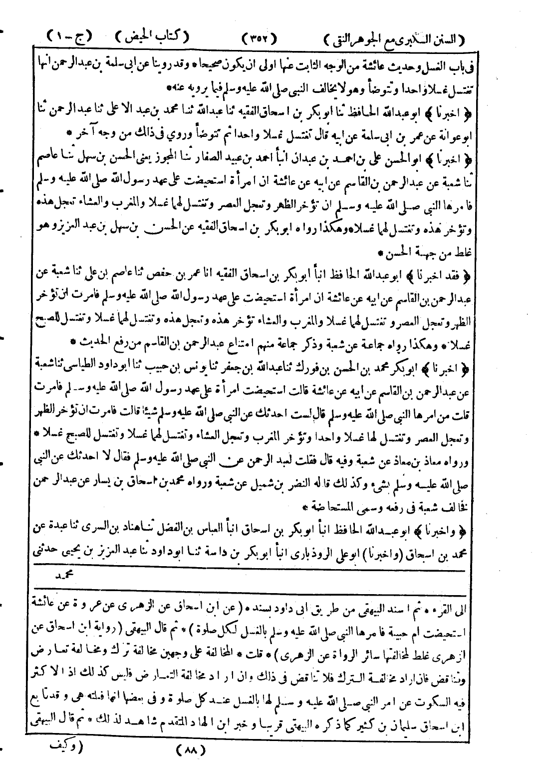 إلى القرء ثم اسند البيهقى من طريق ابى داود بسنده (عن ابن اسحاق عن الزهري عن عروة عن عائشة استحيضت ام حبيبة فأمرها النبي صلى الله عليه وسلم بالغسل لكل صلوة) * ثم قال البيهقى (رواية ابن اسحاق عن الزهري غلط لمخالفها سائر الرواة عن الزهري) * قلت * المخالفة عن وجهين مخالفة ترك ومخالفة تعارض وتناقض فان اراد مخالفة الترك فلا تناقض في ذلك وان اراد مخالفة التعارض فليس كذلك إذا لا كثر فيه السكوت عن امر النبي صلى الله عليه وسلم لها بالغسل كل صلوة وفى بعضها انها فعلته هي وقد تابع ابن اسحاق سليمان بن كثيركما ذكره البيهقى قريبا وخبر ابن الهاد المتقدم شاهد لذلك * ثم قال البيهقى