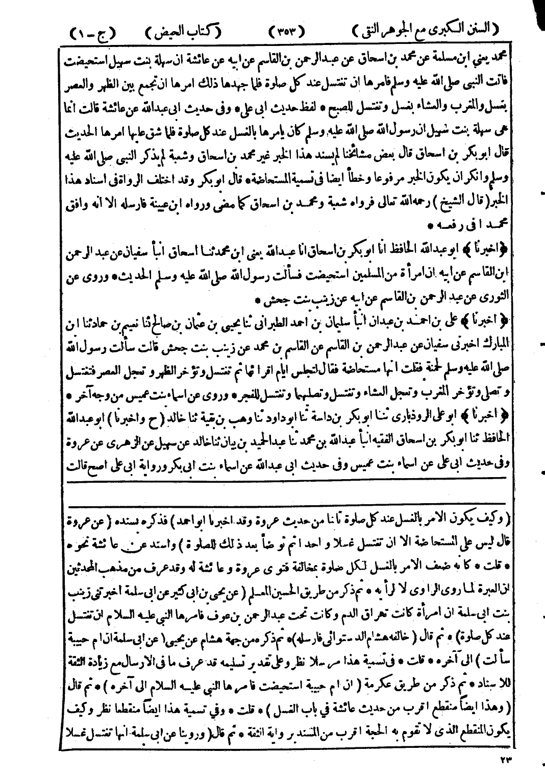 (وكيف يكون الامر بالغسل عند كل صلوة ثانيا من حديث عروة وقد اخبرنا أبو احمد) فذكر بسنده (عن عروة قال ليس على المستحاضة الا ان تغستل غلا واحد اثم توضأ بعد ذلك للصلوة) واسند عن عائشة نحوه
