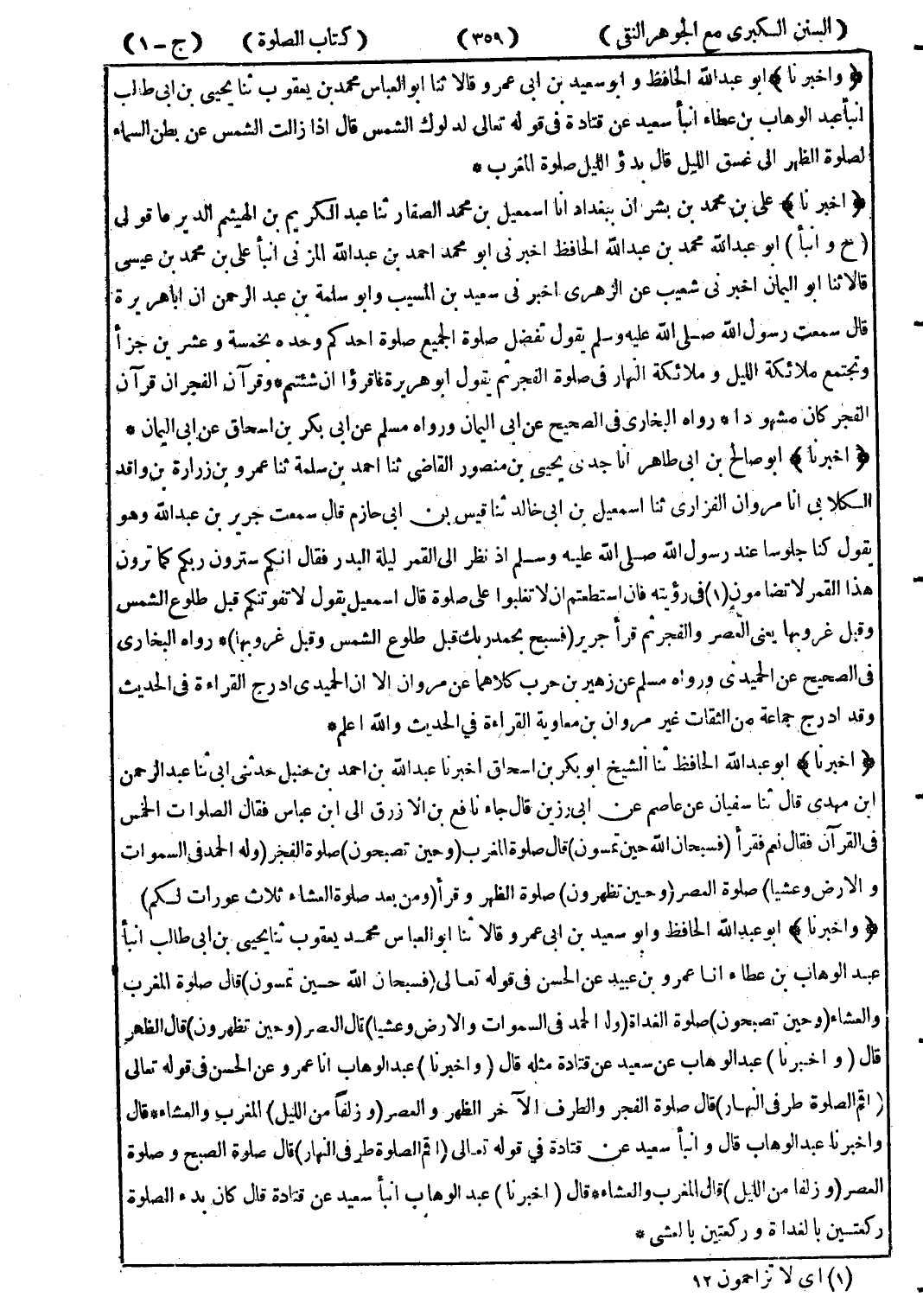 (أخبرنا) أبو صالح بن أبي طاهر انا جدي يحيى بن منصور القاضي ثنا أحمد بن سلمة ثنا عمرو بن زرارة بن واقد الكلابي انا مروان الفزاري ثنا اسمعيل بن ابي خالد ثنا قيس بن أبي حازم قال سمعت جرير بن عبد الله وهو يقول كنا جلوسا عند رسول الله صلى الله عليه وسلم إذ نظر إلى القمر ليلة البدر فقال انكم سترون ربكم كما ترون هذا القمر لا تضامون (1) في رؤيته فان استطعتم ان لا تغلبوا على صلوة قال اسمعيل يقول لا تفوتنكم قبل طلوع الشمس وقبل غروبها يعني العصر والفجر ثم قرأ جرير (فسبح بحمد ربك قبل طلوع الشمس وقبل غروبها).