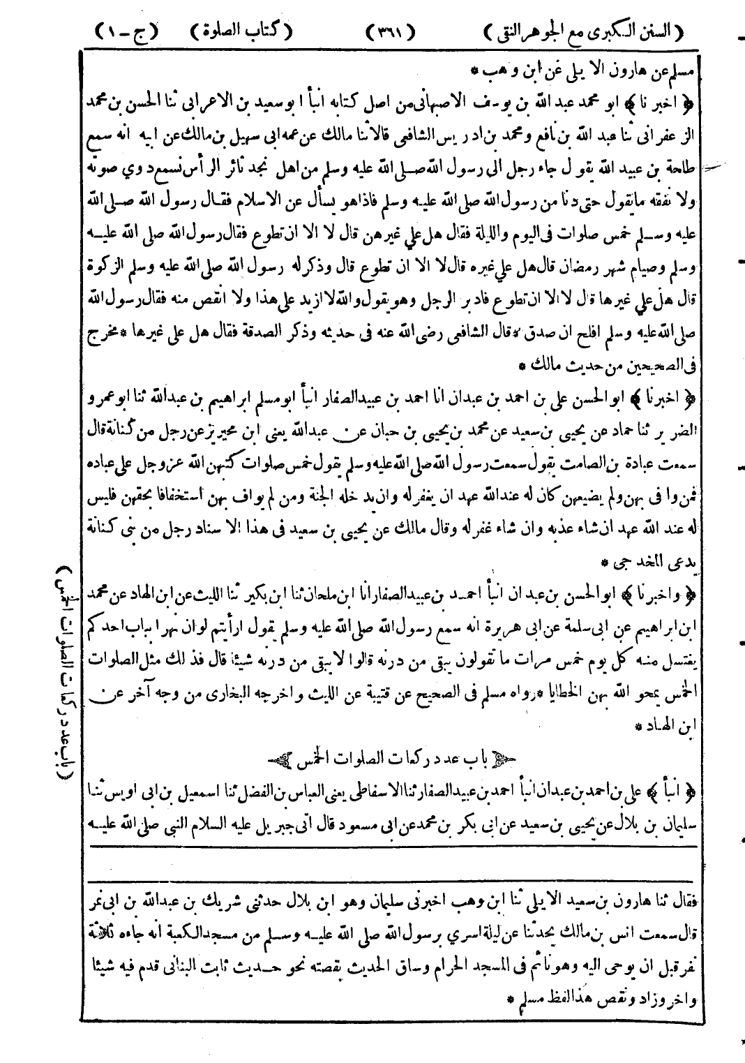 فقال ثنا هارون بن سعد الايلى ثنا ابن وهب اخبرني سليمان وهو ابن بلال حدثنى شريك بن عبد الله بن ابى نمر قال سمعت انس مالك يحدثنا عن ليلة اسري برسول الله صلى الله عليه وسلم من مسجد الكعبة انه جاءه ثلاثة نفر قبل ان يوحى إليه وهو ناثم في المسجد الحرام وساق الحديث بقصته نحو حديث ثابت البنانى قدم فيه شيئا واخرو زاد ونقص هذا الفظ مسلم *