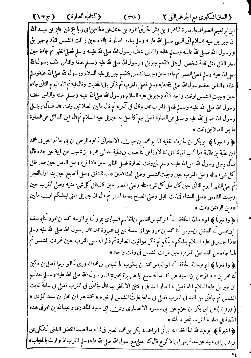 ابن ابراهيم الصواف بالبصرة ثنا عمرو بن بشر الحارثي ثنا برد بن سنان عن عطاء بن أبي رباح عن جابر بن عبد الله ان جبريل عليه السلام اتى النبي صلى الله عيه وسلم يعلمه الصلوة فجاءه حين زالت الشمس فتقدم جبريل ورسول الله صلى الله عليه وسلم خلفه والناس خلف رسول الله صلى الله عليه وسلم فصلى الظهر ثم جاءه حين صار الظل مثل قامة شخص الرجل فتقدم جبريل ورسول الله صلى الله عليه وسلم خلفه والناس خلف رسول الله صلى الله عليه وسلم فصلى العصر ثم جاءه حين وجبت الشمس فتقدم جبريل عليه السلام ورسول الله صلى الله عليه وسلم خلفه والناس خلف رسول الله صلى الله عليه وسلم فصلى المغرب ثم ذكر باقي الحديث وقال فيه أتاه اليوم الثاني جاءه حين وجبت الشمس لوقت واحد فتقدم جبريل عليه السلام ورسول الله صلى الله عليه وسلم خلفه والناس خلف رسول الله صلى الله عليه وسلم فصلى المغرب قال وقال في آخره ثم قال ما بين الصلاتين وقت قال فسأل رجل رسول الله صلى الله عليه وسلم عن الصلوة فصلى بهم كما صلى به جبريل عليه السلام ثم قال أين السائل عن الصلوة ما بين الصلاتين وقت.