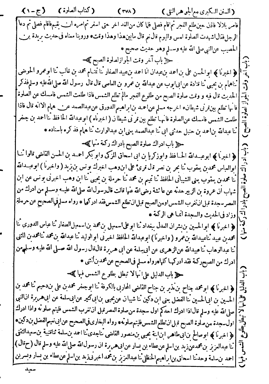 (أخبرنا) أبو الحسين بن بشران العدل ببغداد ثنا أبو علي اسمعيل بن محمد بن اسمعيل الصفار ثنا عباس الدوري ثنا محمد بن عبيد ثنا عبيدالله بن عمرو (وأخبرنا) أبو عبد الله الحافظ أخبرني أبو الوليد ثنا عبد الله بن محمد ثنا محمد بن المثنى ثنا عبد الوهاب ثنا عبيدالله عن الزهري عن أبي سلمة عن أبي هريرة قال قال رسول الله صلى الله عليه وسلم من أدرك من الصبح ركعة فقد أدركها كلها.