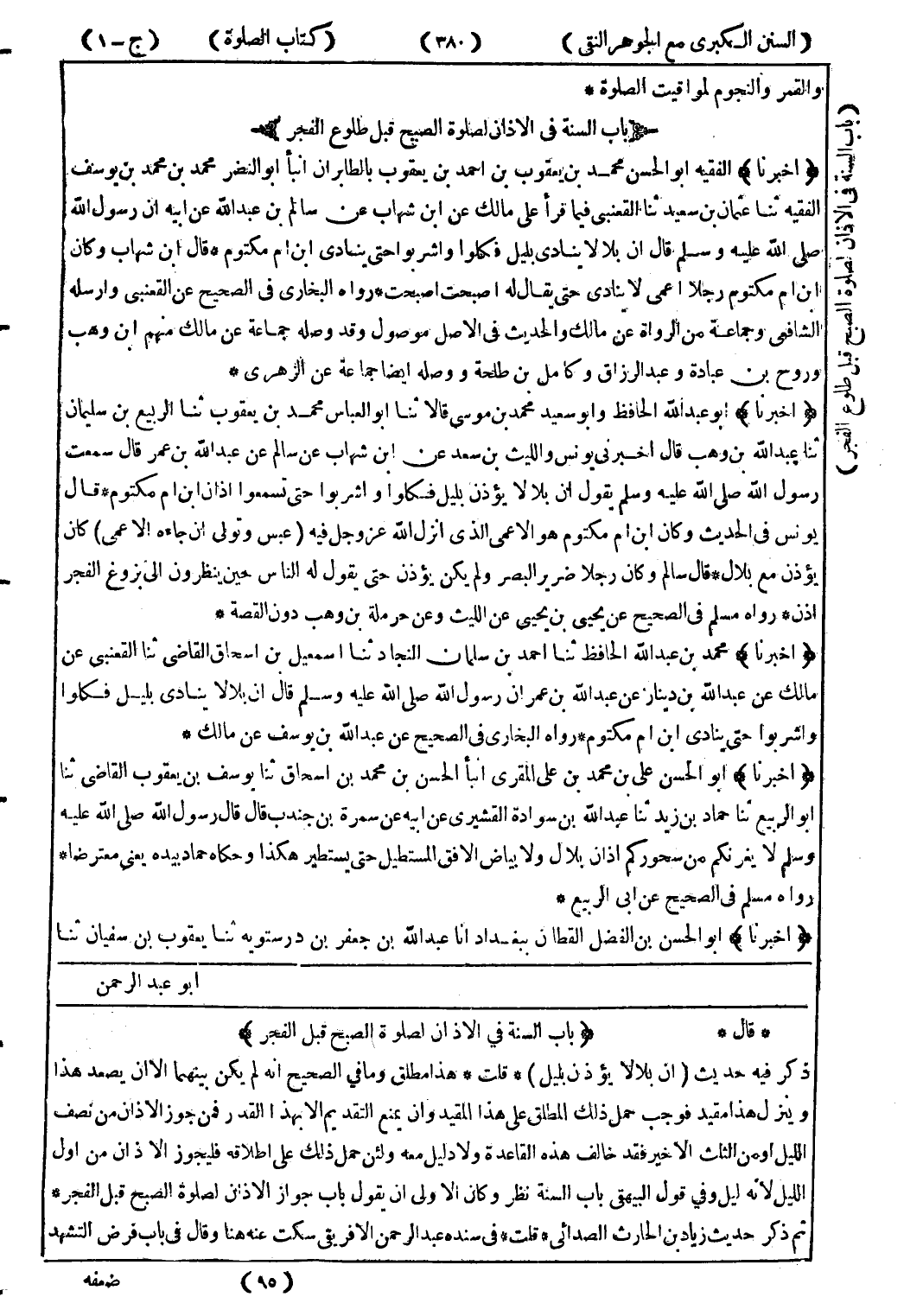 * قال * (باب السنة في الاذان لصلوة الصبح قبل الفجر) ذكر فيه حديث (ان بلا لا يؤذن بليل) * قلت * هذا مطلق وما في الصحى انه لم يكن بينهما الا ان يصعد هذا وينزل هذا مقيد فوجب حمل ذلك المطلق على هذا المقيد وان يمنع التقديم الا بهذا القدر فمن جوز الاذان من نصف الليل أو من الثلث الاخير فقد خالف هذه القاعدة ولا دليل معه ولئن حمل ذلك على اطلاقه فليجوز الا ذان من اول الليل لانه ليل وفي قوله البيهقى باب السنة نظر وكان الاولى ان يقول باب جواز الاذان لصلوة الصبح قبل الفجر * ثم ذكر حديث زياد بن الحارث الصدائى * قلت * في سنده عبد الرحمن الافريقى سكت عنه هنا وقال في باب فرض التشهد