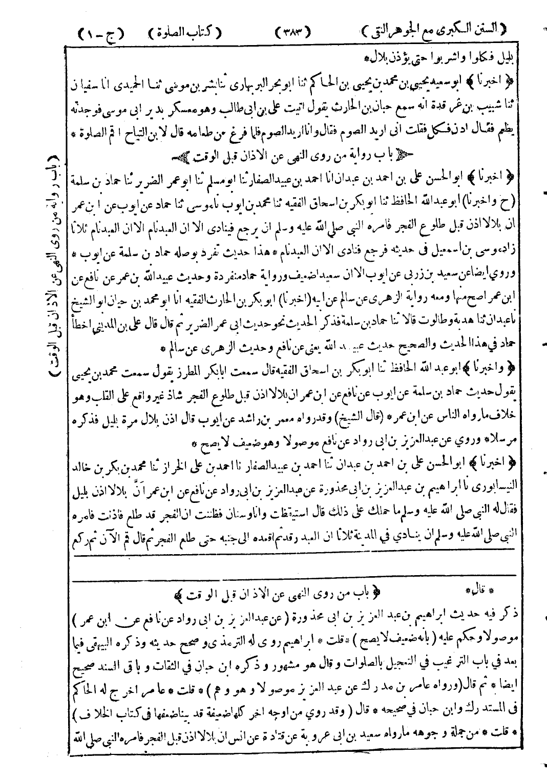 * قال * (باب ماروى النهى عن الاذان قبل الوقت) ذكر فيه حديث ابراهيم بن عبد العزيز ابين محذورة (عن عبد العزيز بن ابى رواد عن نافع عن ابن عمر) موصولا وحك عليه (بانه ضعيف لا يصح) * قلت * ابراهيم ريو له الترمذي وصحح حديثه وذكره البيهقى فيها بعد في باب الترغيب في التعجيل بالصلوات وقال هو مشهور وذكره ابن حبان في الثقات وباقى السند صحيح ايضا * ثم قال (ورواه عمر بن مدرك عن عبد العزيز موصولا وهو وهم) * قلت * عامر اخرج له الحاكم في المستدرك وابن حبان في صحيحه * قال (وقد روي من اوجه اخر كلها ضعيفة قد بينا ضعفها في كتاب الخلاف) * قلت * من جملة وجوهه ما رواه سعد بن ابى عروبة عن قتادة عن انس ان بلا لا اذن قبل الفجر فأمره النبي صلى الله