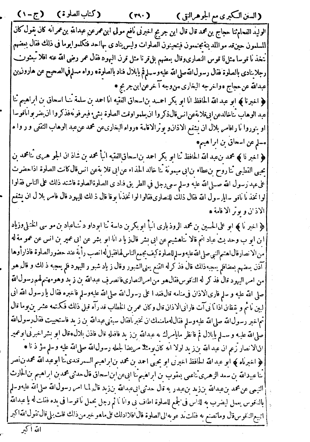 (أخبرناه) أبو عبد الله الحافظ أخبرني أبويحيى أحمد بن محمد بن ابراهيم السمرقندي ثنا أبو عبد الله محمد بن نصر ثنا عبيدالله بن سعد الزهري ثنا عمى يعقوب بن ابراهيم ثنا أبي عن ابن اسحاق قال حدثني محمد بن ابراهيم بن الحارث التيمي عن محمد بن عبد الله بن زيد بن عبد ربه قال حدثني أبي عبد الله بن زيد قال لما أمر رسول الله صلى الله عليه وسلم بالناقوس يعمل ليضرب به للناس في الجمع للصلوة اطاف بى وانا نائم رجل يحمل ناقوسا في يده فقلت له يا عبد الله اتبيع الناقوس قال وما تصنع به فقلت ندعو به إلى الصلوة فقال أفلا أدلك على ما هو خير من ذلك قلت بلى قال تقول الله أكبر