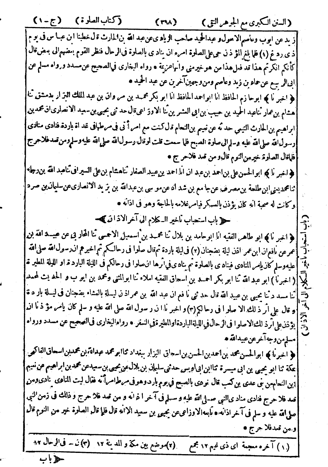 (أخبرنا) أبو طاهر الفقيه انا أبو حامد بن بلال ثنا محمد بن اسمعيل الاحمسي ثنا المحاربي عن عبيدالله بن عمر عن نافع ان ابن عمر اذن ليلة بضجنان (2) في ليلة باردة ثم قال صلوا في رحالكم ثم أخبرهم ان رسول الله صلى الله عليه وسلم كان يأمر المنادي فينادي بالصلوة ثم ينادي في أثرها ان صلوا في رحالكم في الليلة الباردة أو الليلة المطيرة