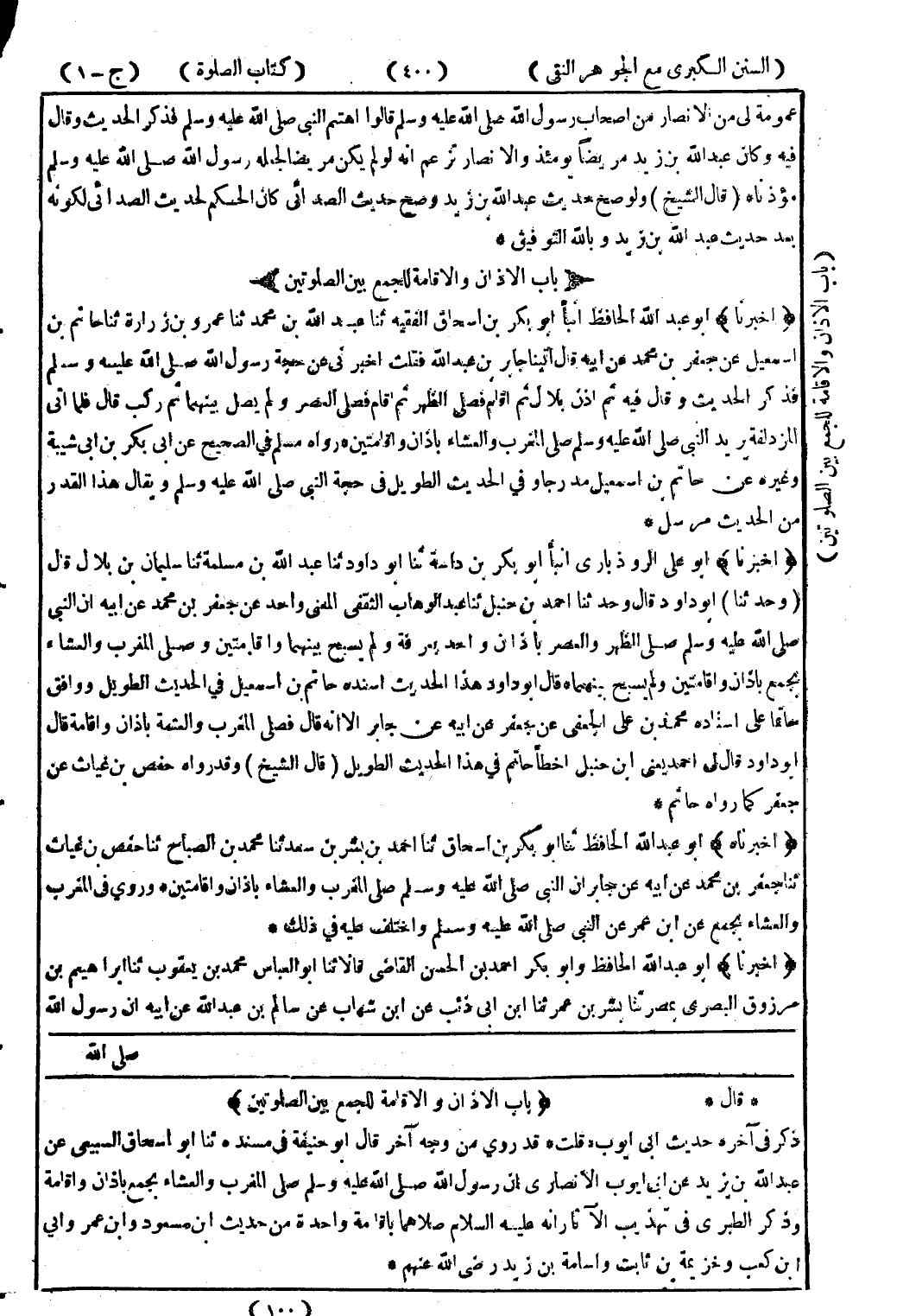 * قال * (باب الاذان والاقامة للجمع بين الصلوتين) ذكر في آخر حديث ابى ايوب * قلت * قد روي من وجه آخر قال أبو حنيفة في مسند ثنا أبو اسحاق السبيعقى عن عبد الله بن يزيد عن ابى ايوب الانصاري ان رسول الله صلى الله عليه وسلم صلى المغرب والعشاء بجمع باذان واقامة وذكر الطبري في تهذيب الآثار انه عليه السلام صلاهما باقامة واحدة من حديث ابن مسعود وابن عمر وابي ابن كعب وخزيمة بن ثابت واسامة بن زيد رضى الله عنهم *