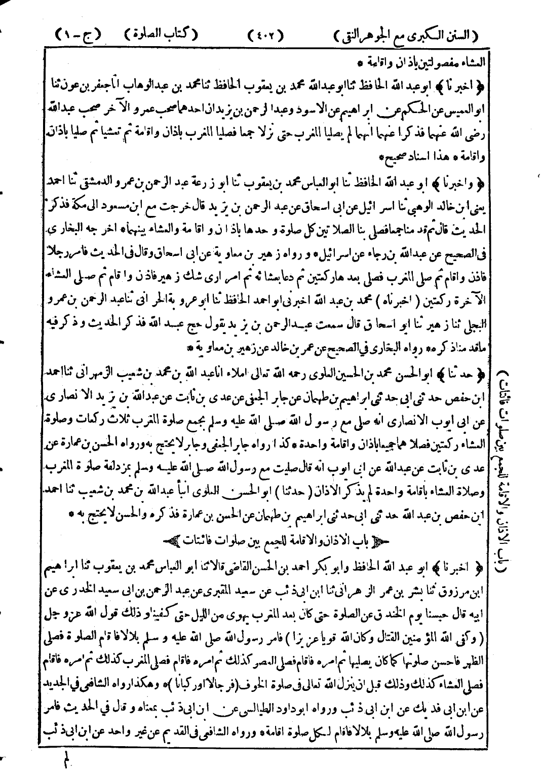 (وأخبرنا) أبو عبد الله الحافظ ثنا أبو العباس محمد بن يعقوب ثنا أبو زرعة عبد الرحمن بن عمرو الدمشقي ثنا أحمد يعني ابن خالد الوهبي ثنا اسرائيل عن أبي اسحاق عن عبد الرحمن بن يزيد قال خرجت مع ابن مسعود إلى مكة فذكر الحديث قال ثم قدمنا جمعا فصلى بنا الصلاتين كل صلوة وحدها باذان واقامة والعشاء بينهما.
