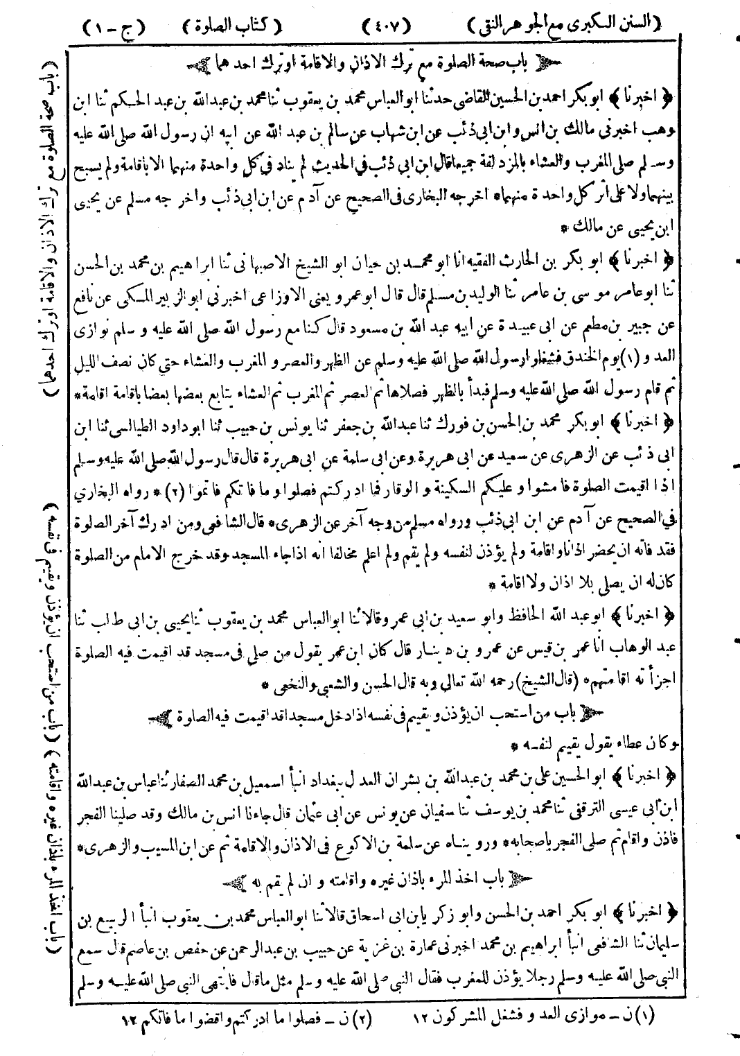 (أخبرنا) أبو بكر محمد بن الحسن بن فورك ثنا عبد الله بن جعفر ثنا يونس بن حبيب ثنا أبو داود الطيالسي ثنا ابن ابي ذئب عن الزهري عن سعيد عن ابي هريرة وعن أبي سلمة عن أبي هريرة قال قال رسول الله صلى الله عليه وسلم إذا اقيمت الصلوة فامشوا وعليكم السكينة والوقار فما أدركتم فصلوا وما فاتكم فاتموا (2).