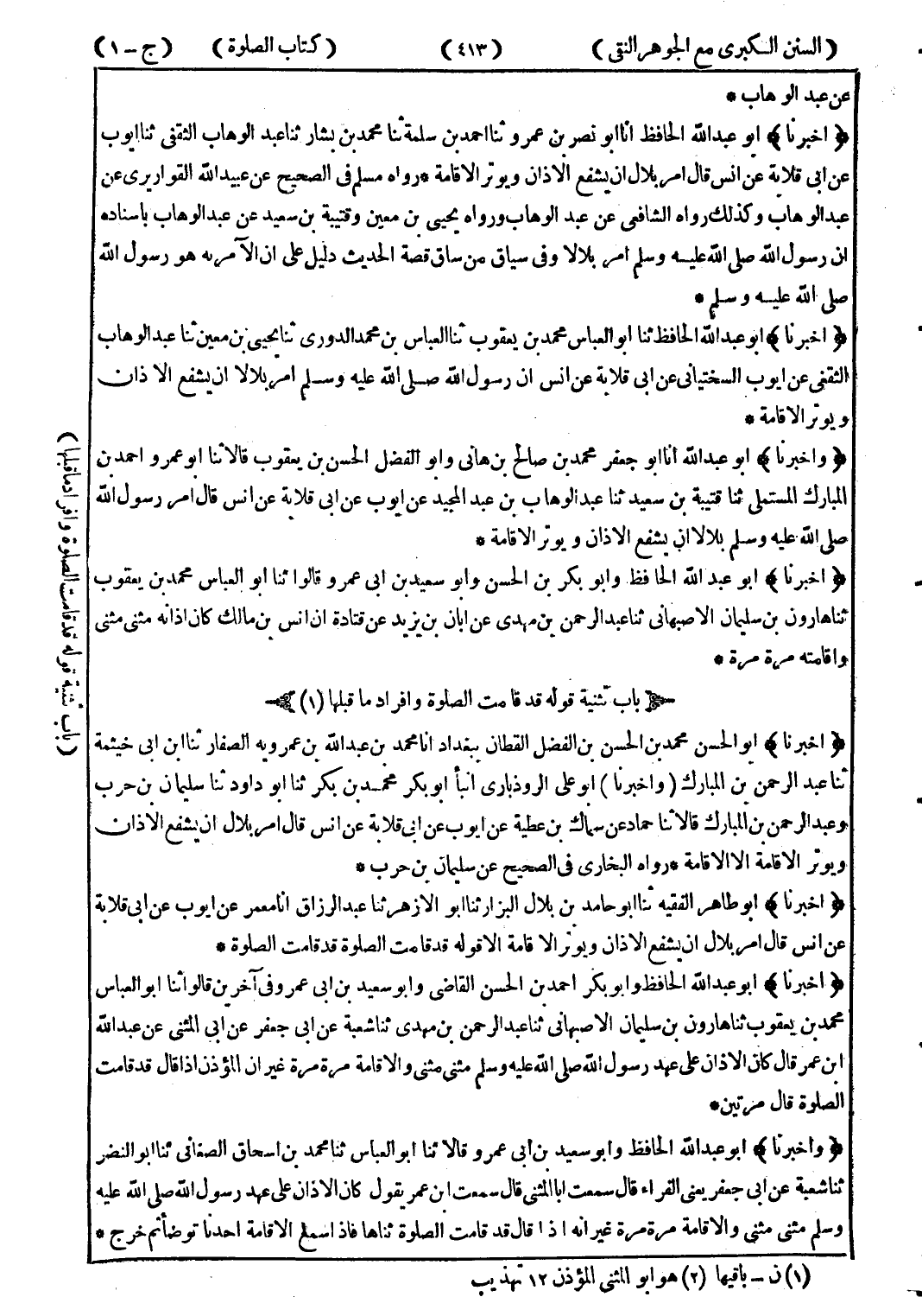 (أخبرنا) أبو طاهر الفقيه ثنا أبو حامد بن بلال البزار ثنا أبو الازهر ثنا عبد الرزاق انا معمر عن أيوب عن أبي قلابة عن أنس قال امر بلال ان يشفع الاذان ويوتر الاقامة الا قوله قد قامت الصلوة قد قامت الصلوة.