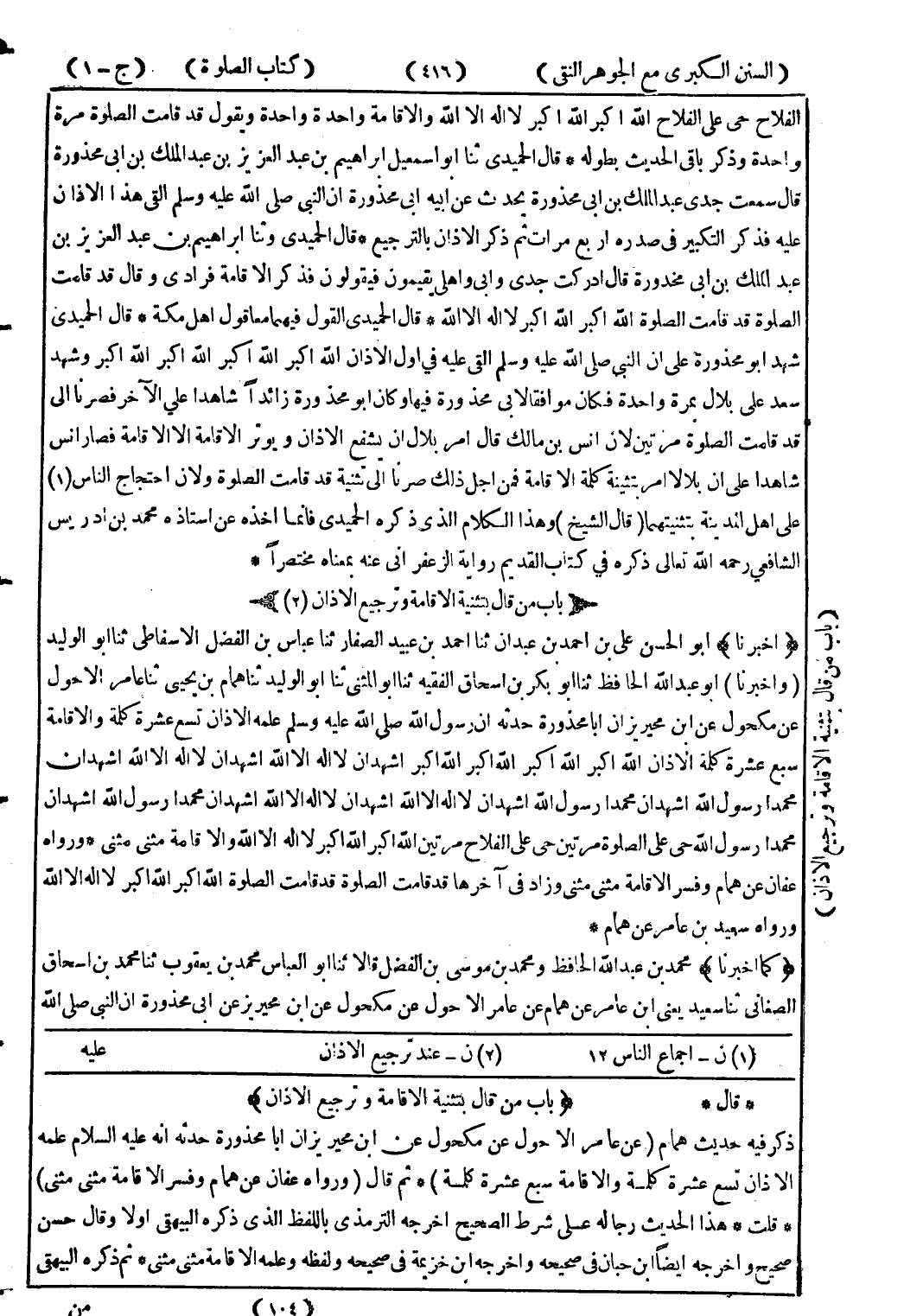* قال * (باب من قال بتثنية الاقامة وترجيح الاذان) ذكر فيه حديث همام (عن عامر الاحول عن مكحول عن مكحول عن ابن محير يزان ابا محذورة حدثه انه عليه السلام علمه الاذان تسع عشرة كلمة والاقامة سبع عشرة كلمة) * ثم قال (ورواه عفان عن همام وفسر الاقامة مثنى مثنى) * قلت * هذه الحديث رجاله على شرط الصحيح اخرجه الترمذي باللفظ الذين ذكره البيهقى اولا وقال حسن