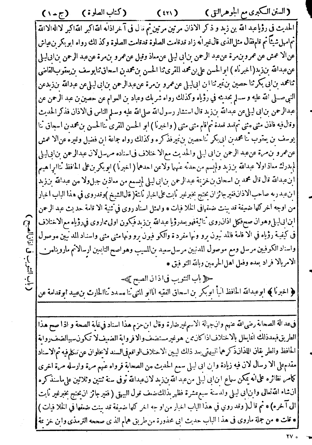 الطريق فبعد ذلك انما يعلل بالاختلاف إذا كان ممن هو غير مستضعف والا فرواية الضعيف لا تكون سببا لضعف رواية الحافظ والطريقان اللذان ذكرهما البيهقى بعد ذلك ليين الاختلاف الواقع في السند لا يخلوان عن تكلم فيه ثم الاسناد مقدم على الارسال لان فيه زيادة وابن ابى ليلى سمع الحديث من الصحابة فرواه عنهم مرة وارسله مرة اخرى كما مر نظائره على انه يمكن سماع ابن ابى ليلى من عبد الله بن زيد لان عبد الله توفى سنة ثنتين وثلاثين على ما سنذكره ان شاء الله تعالى وابن ابى ليلى ولد سنة سبع عشرة فظهر بذلك ضعف قول البيهقى (فغير جائزان يحتج بخير غير ثابت إلى آخره) * ثم قال (وقد روي في هذا الباب اخبرا من اوجه اخر كلها ضعيفة قد بينت ضعفها في الخلافيات) * قلت * من جملة ماروى في هذا الباب حديث ابى محذورة من طريق همام الذى صححه الترمذي وابن حزيمة