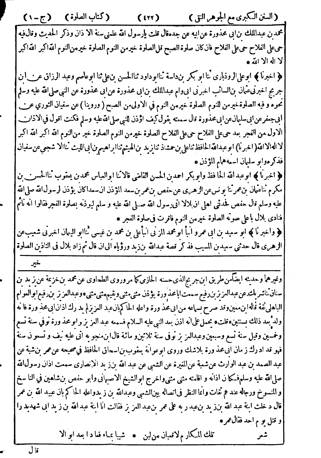 وغيرهما وحديث ايضا من طريق ابن جريج الذى حسنه الحازمى كما مرورى الطحاوي عن محمد بن خزمية عن يزيد بن سناف ثنا شريك عن عبد العزيز رفيع سمعت ابا محذورة يؤذن مثنى مثنى ويقيم مثنى مثنى * وعبد العزيز بن رفيع أبو العوام الباهلى ثقة قاله ابن معين وقد صرح بسماعه من ابى محذورة واعله الحاكم بان عبد العزيز لم يدرك اذان ابى محذورة فانه ولد بعد ذلك بسنتين * قلت * يحمل على انه اذن بعد النبي عليه السلام فسمعه عبد العزيز وبو محذورة توفي سنة تسع وخمسين وقيل سنة تسع وسبعين وعبد العزيز توفى سنة ثلاثين ومائة قال ابن منجوبة اتى عليه نيف وتسعون سنة فهو قد ادرك زمان ابى محذورة بلاشك وروى أبو عوانة يعقوب ابن اسحاق الحافظ في صحيحه عن عمر بن شبة عن عبد الصمد بن عبد الوارث عن شعبة عن المغيرة عن الشعبى عن عبد الله بن زيد الانصاري سمعت اذان رسول الله صلى الله عليه وسلم فكان اذانه وقامته مثنى مثنى واخرج أبو الشيخ الاصبهاني وابو حفص بن شاهين في الناسخ والمنسوخ ورجاله عندهم ثقات وانما النظر في اتصاله بين الشعبى وعبد الله بن زيد واعله الحاكم بان عبيد الله بن عمر قال دخلت ابنة عبد الله بن زيد بن عبد ربه على عمر بن عبد العزيز فقالت انا ابنة عبد الله بن زيد ابى شهد بدرا وقتل يوم احد فقال عمر * شعر تلك المكارم لا قعبان من لبن * شيبا بماء فعادا بعد أبو الا