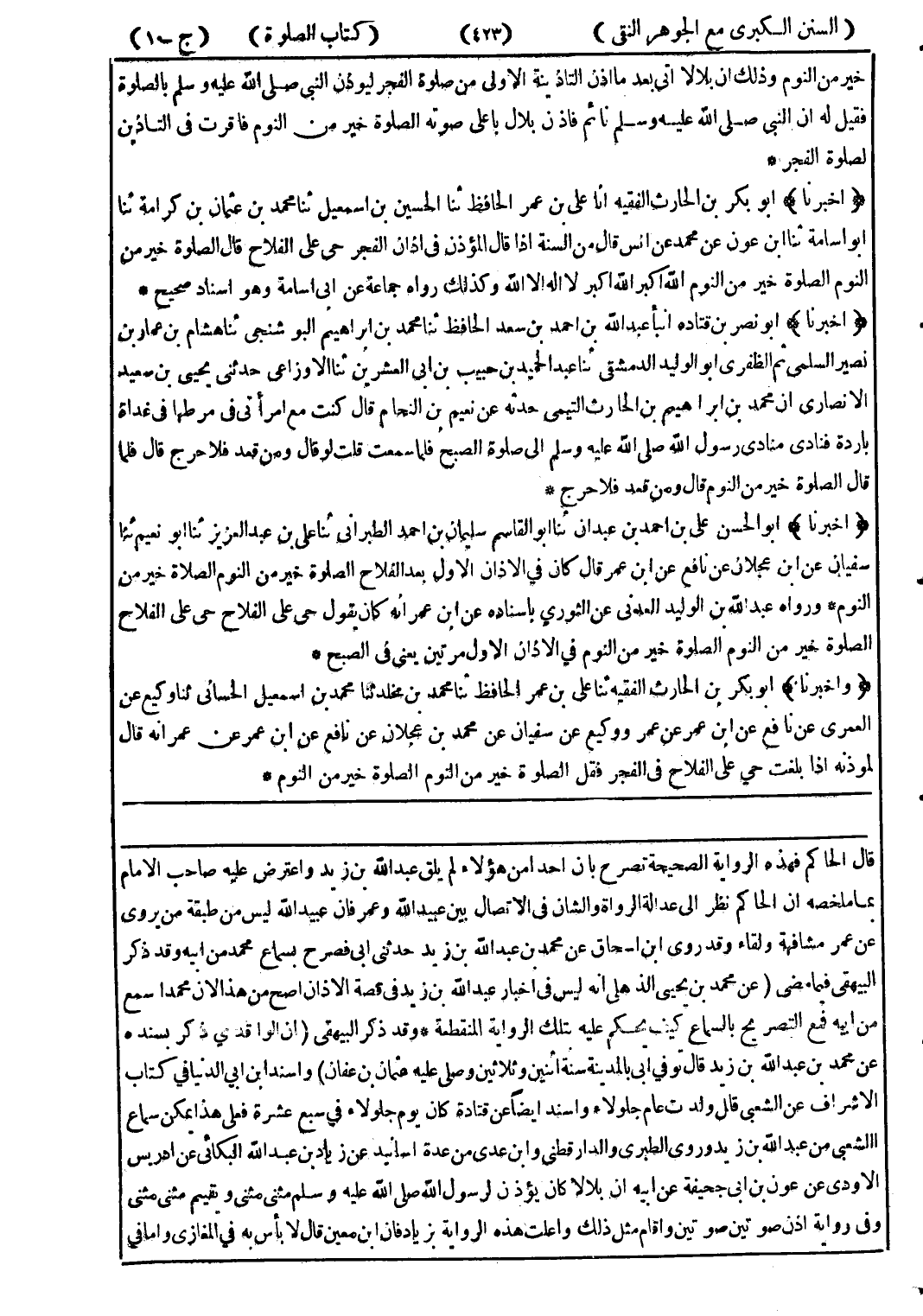 بما ملخصه ان الحاكم نظر إلى عدالة الرواة والشانى في الاتصال بين عبيد الله وعمر فان عبيد الله ليس من طبقة من يروى عن عمر مشافهة ولقاء وقد روى ابن اسحاق عن محمد بن عبد الله بن زيد حدثنى ابى فصرح بسماع محمد من ابيه وقد ذكر البيهقى فيما مضى (عن محمد بن يحيى الذهلى انه ليس في اخبار عبد الله بن زيد في قصة الاذان اصح من هذا لان محمدا سمع من ابيه فمع التصريح بالسماع كيف يحكم عليه بتلك الرواية المنقطعة * وقد ذكر البيهقى (ان الواقدي ذكر بسنده عن محمد بن عبد الله بن زيد قال توفي ابي بالمدينة سنة اثنين وثلاثين وصلى عليه عثمان بن عفان) واسند ابن ابي الدنيا في كتاب الاشراف عن الشعبى قابل ولدت عام جلولاء واسند ايضا عن قتادة كانيوم جلولاء في سبع عشرة فعلى هذا يمكن سماع الشعبى من عبيد الله بن زيد وروى الطبري والدارقطني وابن عدى من عدة اسانيد عن زياد بن عبد الله البكائى عن ادريس الاودى عن عون بن ابى جحيفة عن ابيه ان بلا لا كان يؤذن لرسول الله صلى الله عليه وسلم مثنى مثى ويقيم مثنى مثنى وفى رواية اذن صوتين صوتين واقام مثل ذلك واعلت هذه الرواية بزيادفان ابن معين قال لا بأس به في المغازى واما في