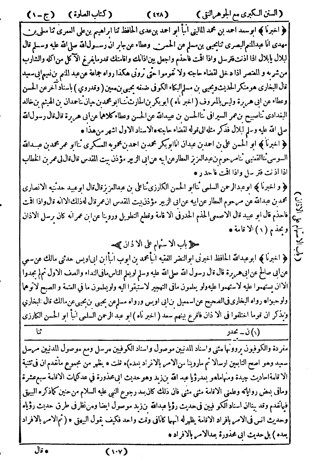 الاقامة احاديث جيدة ومنها ما هو بعد رؤيا عبد الله بن زيد وهو حديث ابى محذورة في عد كلمات الاقامة سبع عشرة وما في بعض رواياته وعلمني الاقامة مثنى مثنى فان ذلك كان بعد رجوع النبي عليه السلام من حنين كما ذكره البيهقى فيما تقدم وقد بينا ان اسناد الكوفيين في حديث رؤيا عبد الله بن زيد موصول ايضا ومن نظر في طرق حديث رؤياه وحديث انس في الامر بافراد الاقامة يظهر له انهما كانا في وقت واحد فكيف يقول البيهقى * (ثم الامر بالافراد بعده) بل حديث ابى محذورة بعد الامر بالافراد *