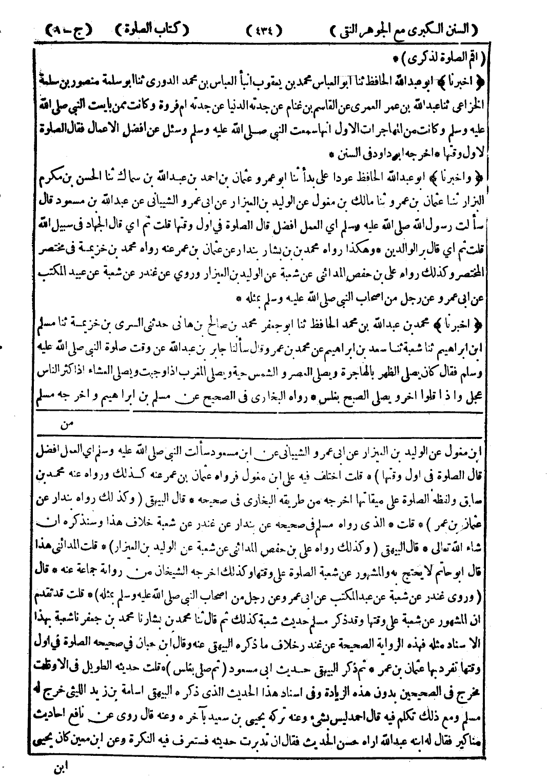 ابن مغول عن الوليد بن الميزار عن ابى عمر والشيبانى عن ابن مسعود سألت النبي صلى الله عليه وسلم اي العمل افضل قال الصلوة في اول وقها) * قلت اختلف فيه على ابن مغلو فواه عثمان بن عمر عنه كذلك ورواه عنه محمد بن سابق ولفظه الصلوة على ميقاتها اخرجه من طريقه البخاري في صحيحه * قال البيهقى (وكذلك رواه بندار عن عثمان بن عمر) * قلت * الذى رواه مسلم في صحيحه عن بندار عن غندر عن شعبة خلاف هذا وسنذكره ان شاء الله تعالى * قال البيهقى (وكذلك رواه على بن حفص المدائني عن شعبة عن الوليد بن العيزار) * قلت المدائني هذا قال أبو حاتم لا يحتج به والمشهور عن شعبة الصلوة على وقتها وكذلك اخرجه الشيخان من رواية جماعة عنه * قال (وروى غندر عن شعبة عن عبد المكتب عن ابى عمرو عن رجل من اصحاب النى صلى الله عليه وسلم بمثله) * قلت قد تقدم ان المشهور عن شعبة على وقتها وقد ذكر مسلم حديث شعبة كذلك ثم قال ثنا محمد بن بشارنا محمد بن جعفرنا شعبة بهذا الاسناده مثله فهذه الرواية الصحيحة عن غندر خلاف ما ذكره البيهقى عنه وقال ابن حبان في صحيحه الصلوة في اول وقتها تفرد بها عثمان بن عمر * ثم ذكر البيهقى حديث ابى مسعود (ثم صلى بغلس) * قلت حديثه الطويل في الاوقات مخرج في الصحيحين بدون هذه الزيادة وفى اسناد هذا الحديث الذى ذكره البيهقى اسامة بن زيد الليثى خرج له مسلم ومع ذلك تكلم فيه قال احمد ليس بشئ وعنه تركه يحيى بنسعيد بآخره وعنه قال روى عنه نافع احاديث مناكير فقال له ابنه عبد الله اراه حسن الحديث فقال ان تدبرت حديثه فستعرف فيه النكرة وعن ابن معين كان يحيى