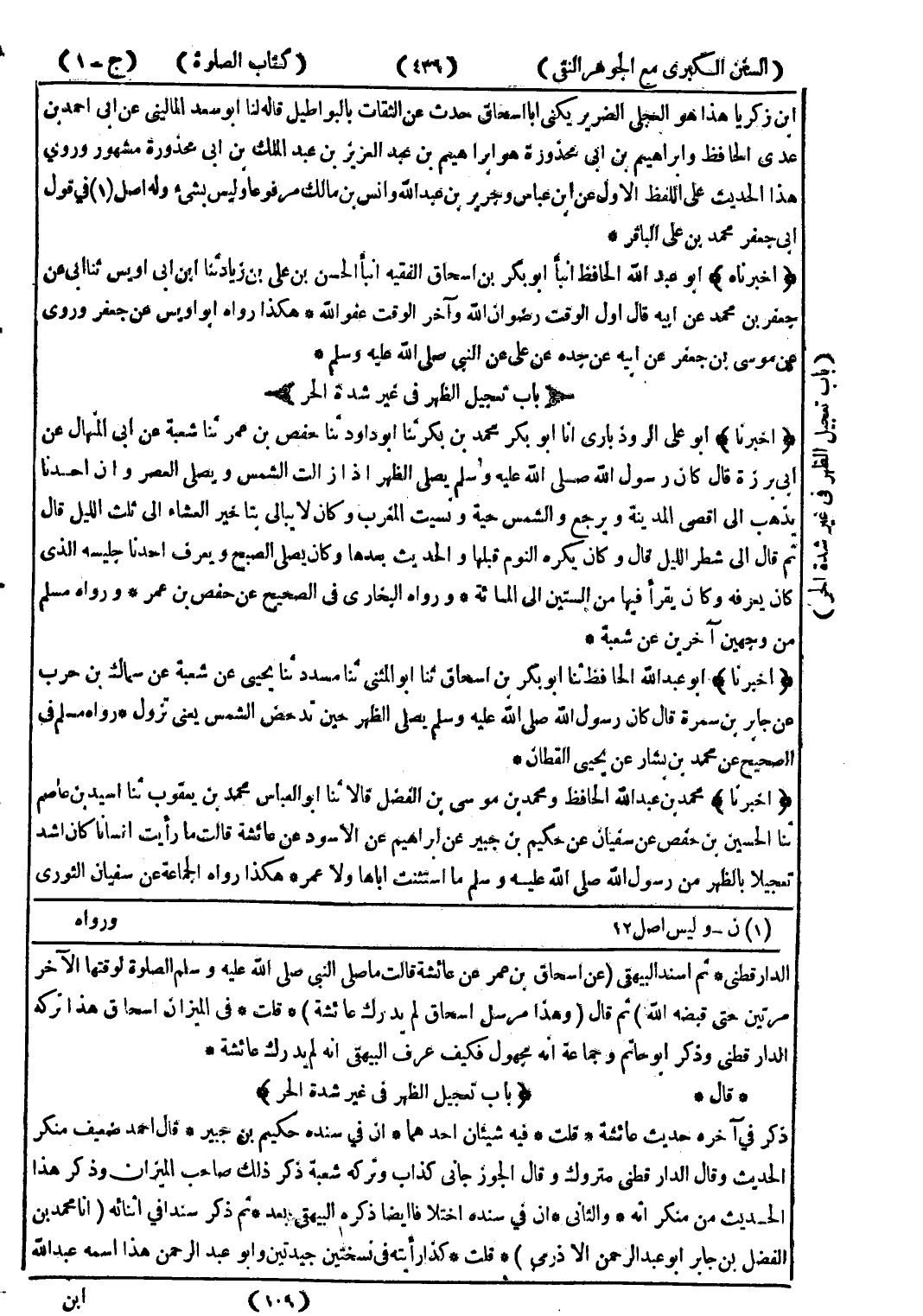 الدارقطني * ثم اسند البيهقى (عن اسحاق بن عمر بن عائشة قالت ما صلى النبي صلى الله عليه وسلم الصلوة لوقتها الاخر مرتين حتى قبضه الله) ثم قال (وهذا مرسل اسحاق لم يدرك عائشة) * قلت * في الميزان اسحاق هذا تركه الدارقطني وذكر أبو حاتم وجماعة انه مجهول فكيف عرف البيهقى انه لم يدرك عائشة * * قال * (باب تعجيل الظهر في غير شدة الحر) ذكر في آخره حديث عائشة * قلت * فيه شيئان احدهما * ان في سنده حكيم بن جبير * قال احمد ضعيف منكر الحديث وقال الدارقطني متروك وقال الجوزجانى كذاب وتركه شعبة ذكر ذلك صاحب الميزان وذكر هذا الحديث من منكراته * والثانى * في سنده اختلافا ايضا ذكره البيهقى بعد * ثم ذكر سندا في اثنائه (انا محدم بن الفضل بن جابر أبو عبد الرحمن الاذرمى) * قلت * كذا رأيته في نسختين جيدتين وابو عبد الرحمن هذا اسمه عبد الله