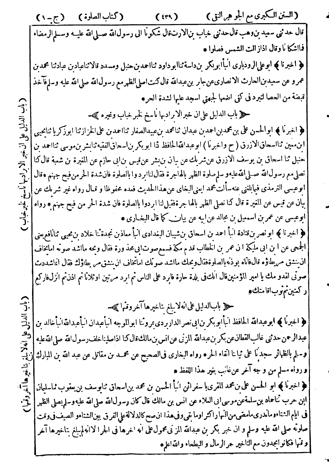 (أخبرنا) أبو علي الروذباري انبأ أبو بكر بن داسة ثنا أبو داود ثنا أحمد بن حنبل ومسدد قالا ثنا عباد بن عباد ثنا محمد بن عمرو عن سعيد بن الحارث الانصاري عن جابر بن عبد الله قال كنت اصلي الظهر مع رسول الله صلى الله عليه وسلم فآخذ قبضة من الحصا لتبرد في كفي اضعها لجهتي اسجد عليها لشدة الحر.