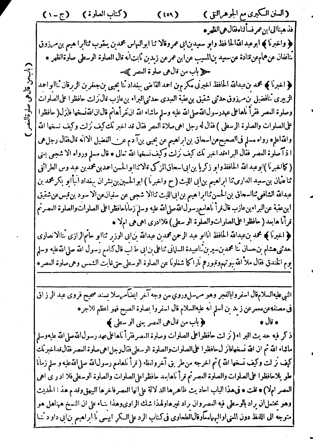 النبي عليه السلام قال اسفر وابا الفجر وهو مرسل وروي من وجه آخر ايضا مرسلا بسند صحيح فروى عبد الرزاق في مصنفه عن معمر عن زيد بن اسلم انه عليه السلام قال اسفروا بصلوة الصبح فهو اعظم للاجر * * قال * (باب من قال هي العصر يعنى الوسطى) ذكر فيه حديث البراء (نزلت حافظوا على الصلوات وصلوة العصر فقرأنا ها على عهد رسول الله صلى الله عليه وسلم ما شاء الله ثم ان الله نسخها فانزل حافظوا على الصلوات والصلوة الوسطى فقال رجل اهى صلوة العصر فقال قد اخبرتك كيف نزلت وكيف نسخها الله) ثم اخرجه من طريق آخرو لفظه (قرأنا ها مع رسول الله صلى الله عليه وسلم زمانا طويلا حافظوا على الصلوة والصلوة العصر قرأنا ها بعد حافظوا على الصلوات والصلوة الوسطى فلا ادرى اهى العصر ام لا) * قلت * في هذا الباب احاديث ظاهرها الدلالة على انها العصر فاخرها البيهقى وقدم هذا الحديث العصر ام لا) * قلت * في هذا الباب احاديث ظاهرها الدلالة على انها العصر فاخرها البيهقى وقدم هذا الحديث وهو يحتمل ان يراد بالوسطى فيه العصر وان يراد غيرها ولهذا شك الراوى وهذا بناء على ان النسخ ههنا هل هو متوجه إلى اللفظ دون المعنى أو اليهما معا وقال الطحاوي في كتاب الرد على الكرايسى نا ابراهيم بن ابى داود ثنا