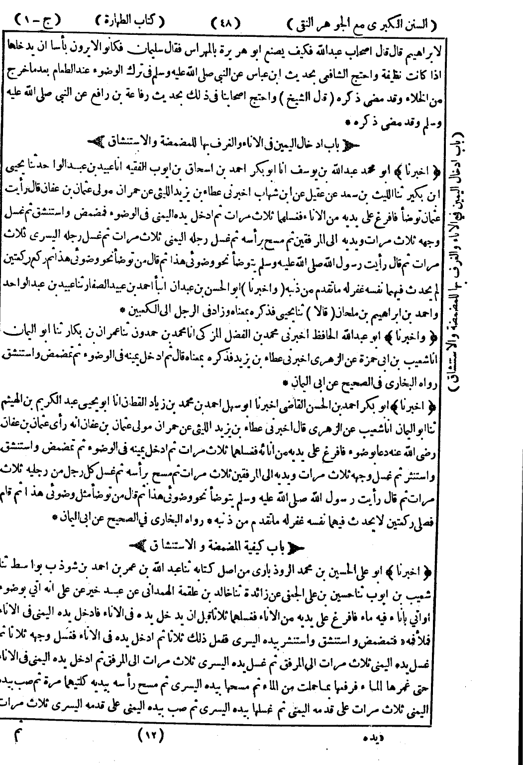 (أخبرنا) أبو محمد عبد الله بن يوسف انا أبو بكر احمد بن اسحاق بن ايوب الفقيه انا عبيد بن عبد الواحد ثنا يحيى ابن بكير ثنا الليث بن سعد عن عقيل عن ابن شهاب اخبرني عطاء بن يزيد الليثى عن حمران مولى عثمان بن عفان قال رأيت عثمان توضأ فافرغ على يديه من الاناء فغسلهما ثلاث مرات ثم ادخل يده اليمنى في الوضوء فمضمض واستنشق ثم غسل