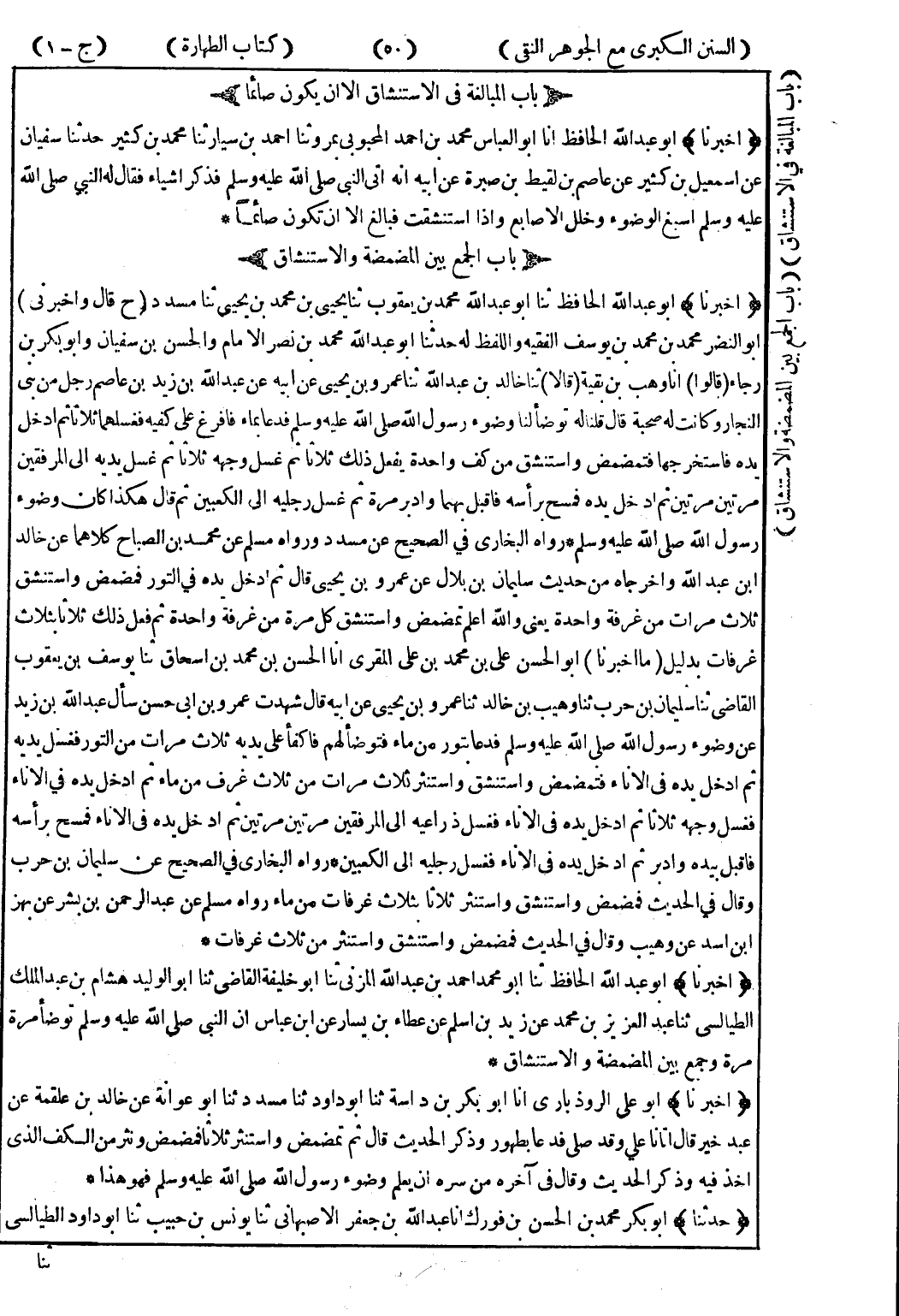 (أخبرنا) أبو عبد الله الحافظ ثنا أبو محمد احمد بن عبد الله المزني ثنا أبو خليفة القاضى ثنا أبو الوليد هشام بن عبد الملك الطيالسي ثنا عبد العزيز بن محمد عن زيد بن اسلم عن عطاء بن يسار عن ابن عباس ان النبي صلى الله عليه وسلم توضأ مرة مرة وجمع بين المضمضة والاستنشاق.