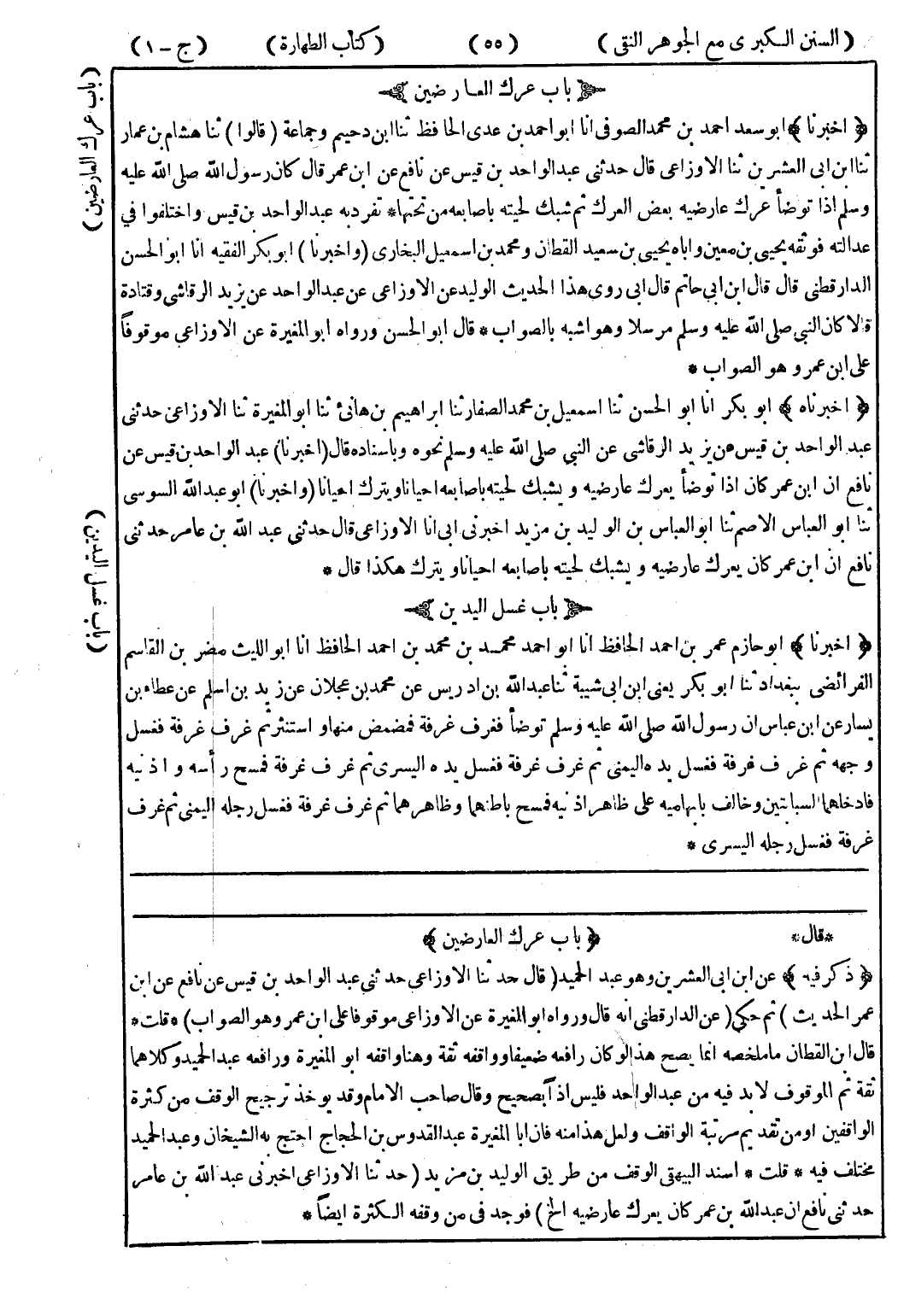 مختلف فيه * قلت * اسند البيهقى الوقف من طريق الوليد بن مزيد (حدثنا الاوزاعي اخبرني عبد الله بن عامر حدثنى نافع ان عبد الله بن عمر كان يعرك عارضيه الخ) فوجد في من وقفه الكثرة ايضا *