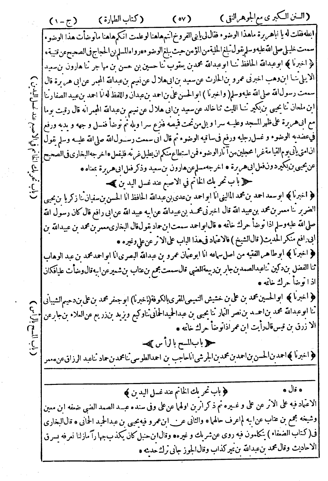 * قال * (باب تحريك الخاتم عند غسل اليدين) الاعتماد فيه على الاثر عن على وغيره ثم ذكر اثرين اولهما عن على وفى سنده عبد الصمد الضبى ضعفه ابن معين وشيخه مجمع بن عتاب عن ابيه لم اعرف حالهما * والثانى عن ابن عمرو فيه يحيى بن عبد الحميد الحمانى * قال البخاري في (كتاب الضعفاء) يتكلمون فيه روى عن شريك وغيره * وقال ابن حنبل كان يكذب جهارا مازلنا نعرفه يسرق الاحاديث وقال محمد بن عبد الله بن نمير كذاب وقال الجوز جانى ترك حديثه *