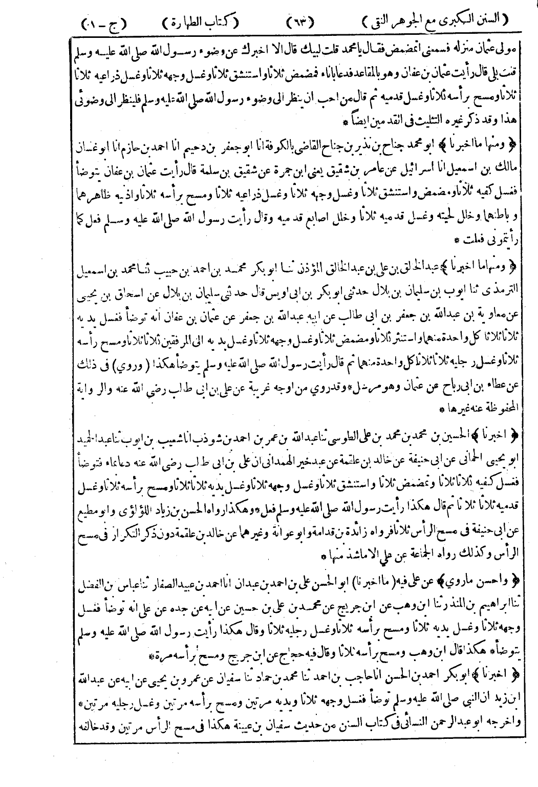 وهكذا رواه الحسن بن زياد اللؤلؤي وابو مطيع عن ابى حنيفة في مسح الرأس ثلاثا فرواه زائده بن قدامة وابو عوانة وغيرهما عن خالد بن علقمة دون ذكر التكرار في مسح الرأس وكذلك رواه الجماعة عن علي الا ما شذ منها.