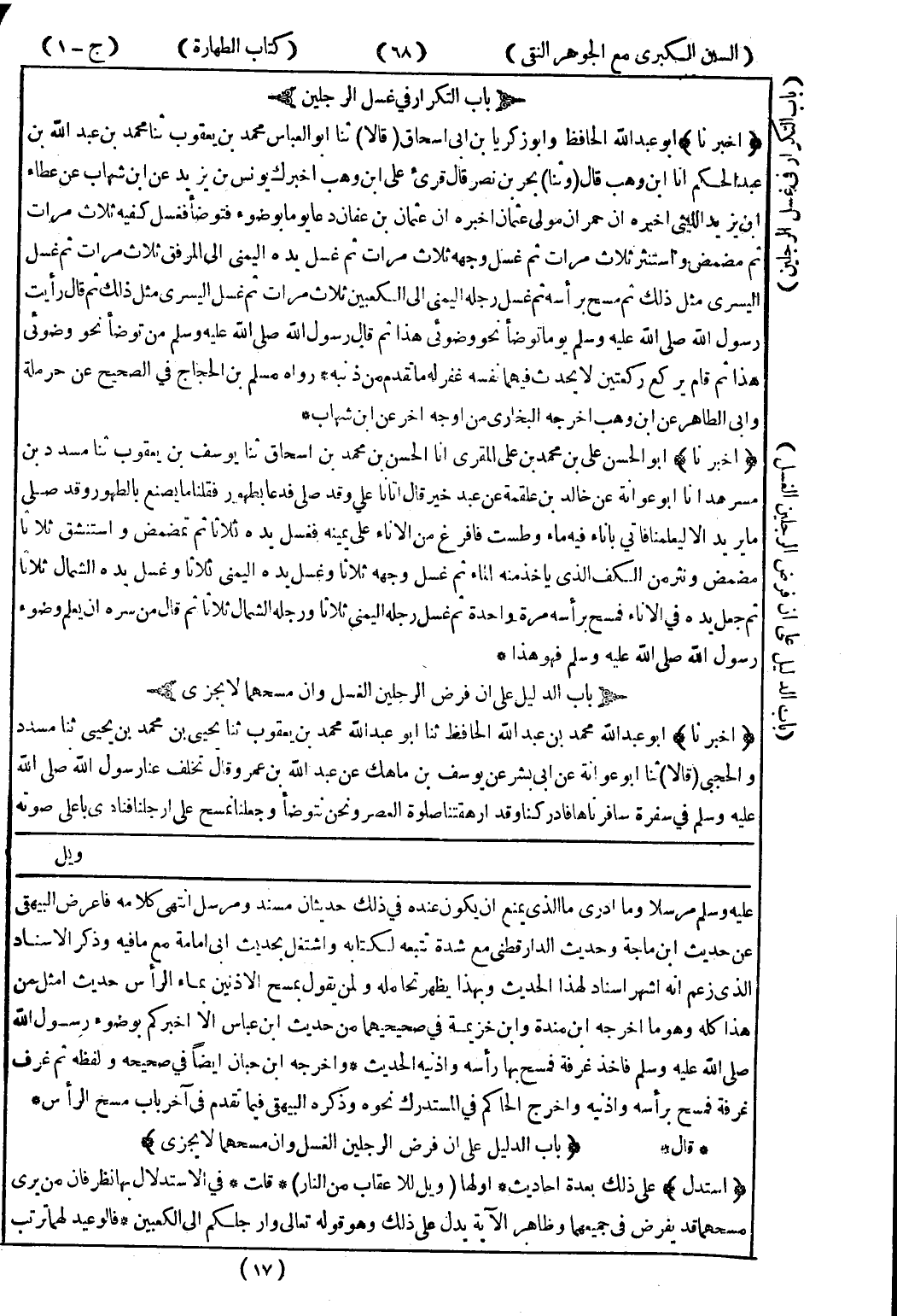 عليه وسلم مرسلا وما ادرى الذى يمنع ان يكون عنده في ذلك حديثان مسند ومرسل انتهى كلامه فاعرض البيهقى عن حديث ابن ماجة وحديث الدارقطني مع شدة تتبعة لكتابه واشتغل بحديث ابى امامة مع ما فيه وذكر الاسناد الذى زعم انه اشره اسناد لهذا الحديث وبهذا يظهر تحامله ولمن يقول بمسح الاذنين بماء الرأس حديث امثل من هذا كله وه ما اخرجه ابن مندة وابن خزيمة في صحيحهما من حديث ابن عباس الا اخبركم بوضوء رسول الله صلى الله عليه وسلم فاخذ غفرفة فمسح بها رأسه واذنيه الحديث * واخرجه ابن حبان ايضا في صحيحه ولفظه ثم غرف غرفة فمسح برأسه واذنيه واخرج الحاكم في المستدرك نحو وذكره البيهقى فيما تقدم في آخر باب مسح الرأس * * قال * (باب الدليل على ان فرض الرجلين الغسل وان مسحهما لا يجزى) (استدل) على ذلك بعدة احاديث * اولها (ويل للاعقاب من النار) * قلت * في الاستدلال بها نظر فان من يرى مسحهما قد يفرض في جميعهما وظاهر الآية يدل على ذلك وهو قوله تعالى وارجلكم إلى الكعبين * فالوعيد لهما ترتب