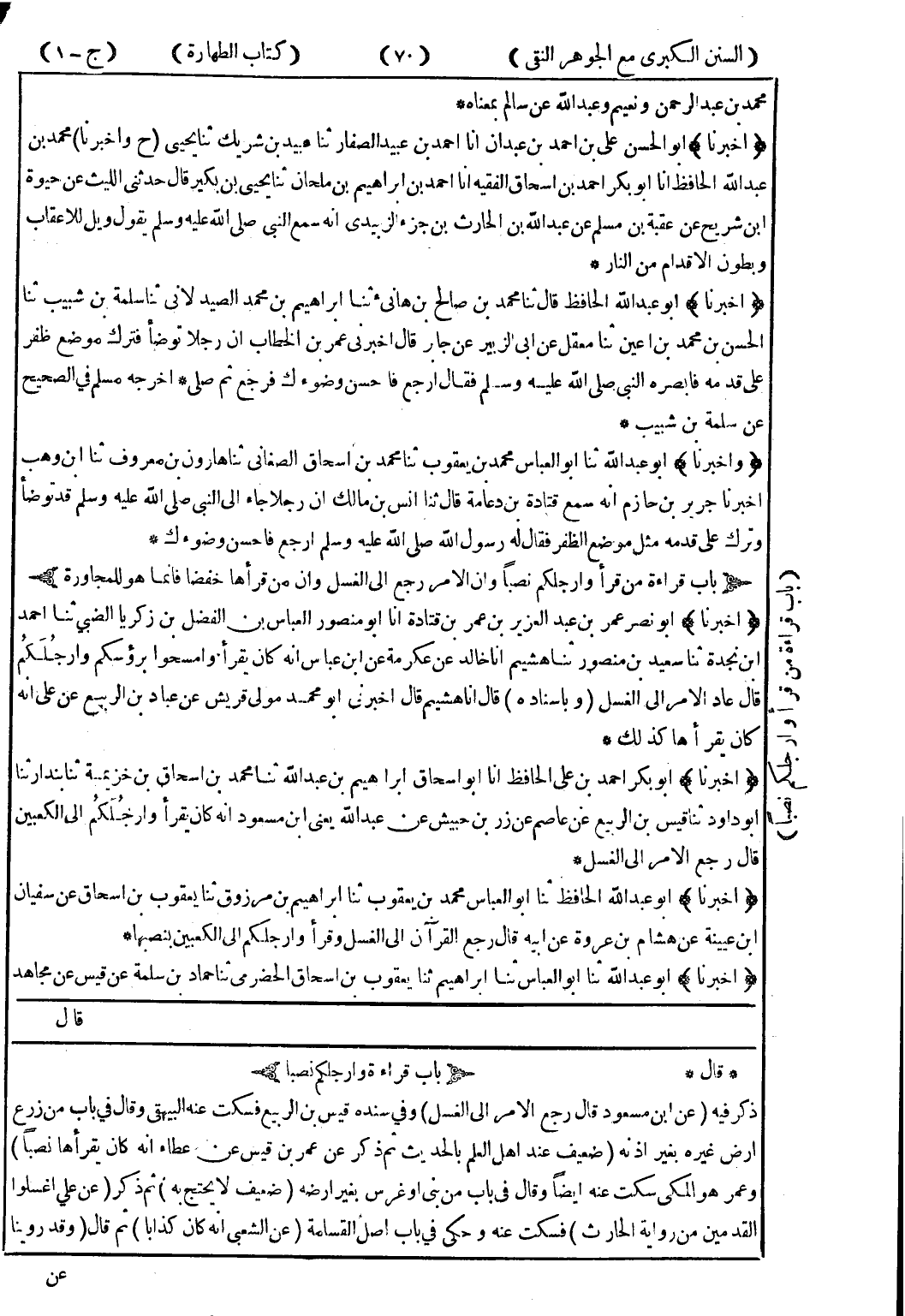 * قال * (باب قراءة وارجلكم نصبا) ذكر فيه (عن ابن مسعود قال رجع الامر إلى الغسل) وفي سنده قيس بن الربيع فسكت عنه البيهقى وقال في باب من زرع ارض غيره اذنه (ضعيف عند اهل العلم بالحديث ثم ذكر عن عمر بن قيس عن عطاة انه كان يقرأها نصبا) وعمر هو الملكى سكت عنه ايضا وقال في باب من بنى أو غرس بغير ارضه (ضعيف لا يحتج به) ثم ذكر (عن علي علي اغسلوا القدمين من رواية الحارث) فسكت عنه وحكى في باب اصل القسامة (عن الشعبى انه كان كذابا) ثم قال (وقد روينا