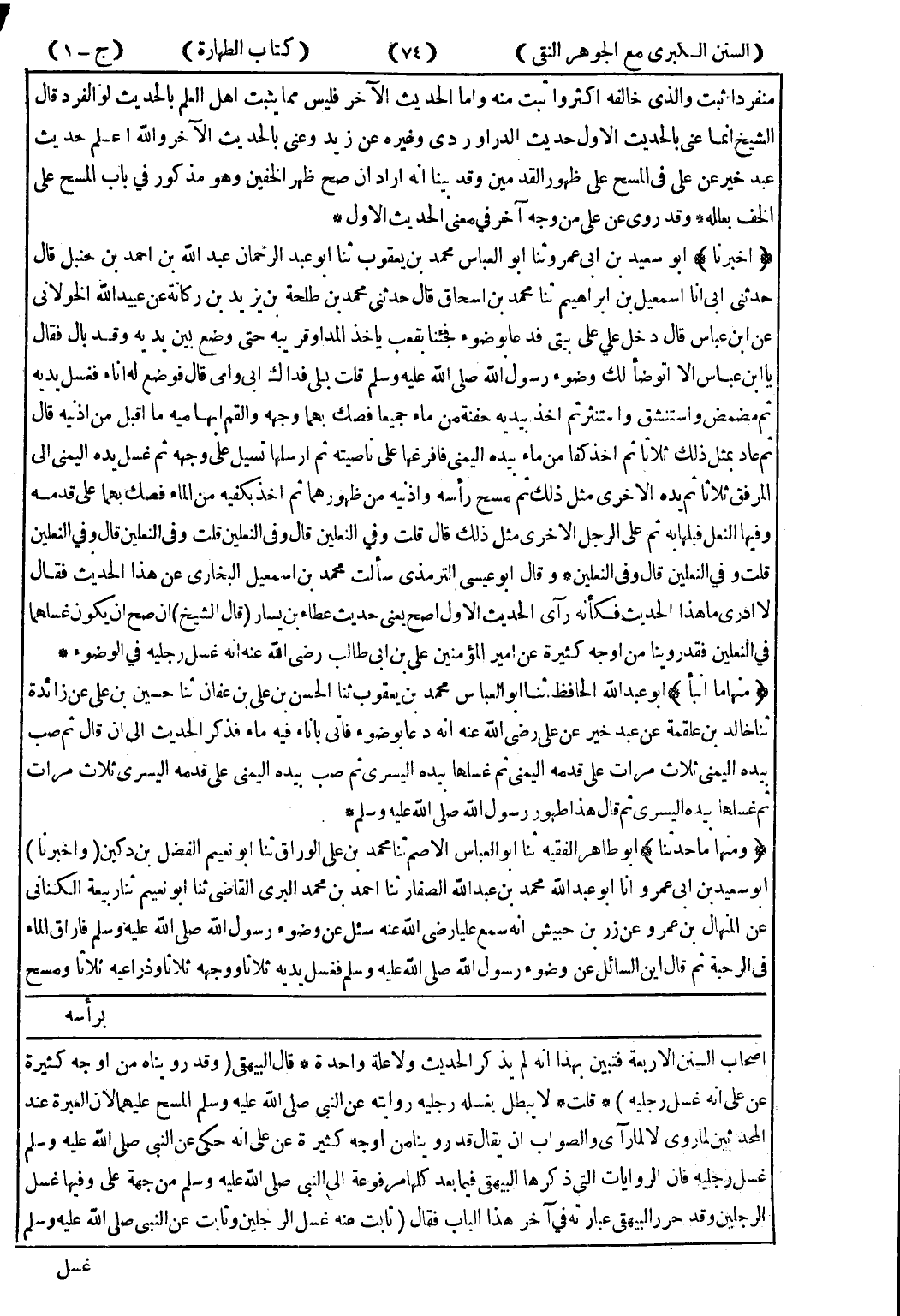 اصحاب السنن الاربعة فتبين بهذا انه لم يذكر الحديث ولا علة واحدة * قال البيهقى (وقد رويناه من اوجه كثيرة عن على انه غسل رجليه) * قلت * لا يبطل بغسله رجليه روايته عن النبي صلى الله عليه وسلم المسح عليهما الان العبرة عند المحدثين لما روى لا لما رأى والصواب ان يقال قد روينا من اوجه كثيرة عن على انه حكى عن النبي صلى الله عليه وسلم غسل رجليه فان الروايات التى ذكرها البيهقى فيما بعد كلها مرفوعة إلى النبي صلى الله عليه واله وسلم من جهة على وفيها غسل الرجلين وقد حرر البيهقى عبارته في آخر هذا الباب فقال (ثابت عنه غسل الرجلين وثابت عن النبي صلى الله عليه وسلم