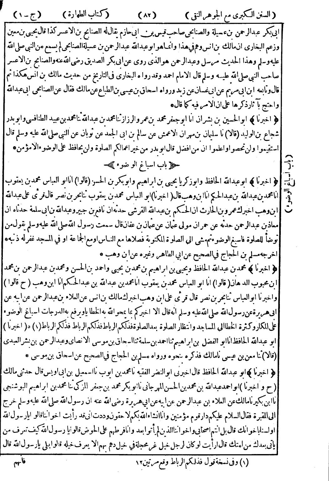 (أخبرنا) محمد بن عبد الله الحافظ ويحيى بن ابراهيم بن محمد بن يحيى واحمد بن الحسين ومحمد بن عبد الرحمن بن محمد ابن محبوب الدهان (قالوا) انا أبو العباس محمد بن يعقوب انا محمد بن عبد الله بن عبد الحكم انا ابن وهب (ح قالوا) واخبرنا أبو العباس ثنا بحر بن نصر قال قرئ على ابن وهب اخبرك مالك بن انس عن العلاء بن عبد الرحمن عن ابيه عن ابى هريرة عن رسول الله صلى الله عليه وسلم انه قال الا اخبركم بما يمحو الله به الخطايا ويرفع به الدرجات اسباغ الوضوء على المكار وكثرة الخطا إلى المساجد وانتظار الصلوة بعد الصلوة فذلكم الرباط فذلكم الرباط فذلكم الرباط (1).