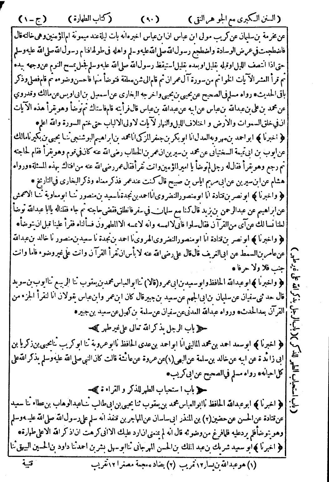 (وأخبرنا) أبو عبد الله الحافظ وابو سعيد بن ابى عمرو (قالا) ثنا أبو العباس محمد بن يعقوب ثنا الربيع ثنا ايوب بن سويد قال حدثنى سفيان عن سليمان بن ابى الجهم عن سعيد بن جبير قال كان ابن عمر وابن عباس يقولان انا لنقرأ الجزء من القرآن بعد الحدث.