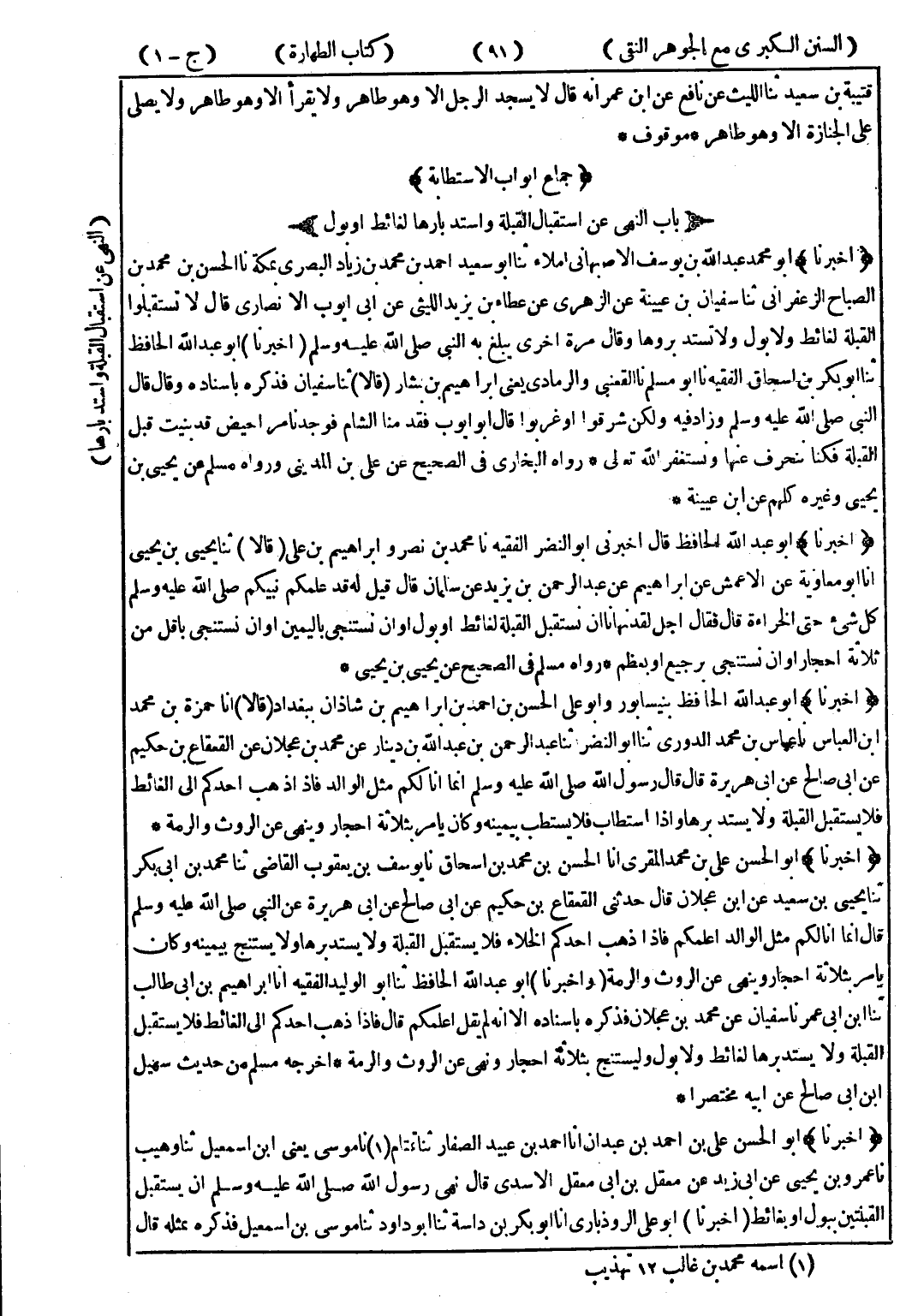 (أخبرنا) أبو محمد عبد الله بن يوسف الاصبهاني املاء ثنا أبو سعيد احمد بن محمد بن زياد البصري بمكة نا الحسن بن محمد بن الصباح الزعفران ثنا سفيان بن عيينة عن الزهري عن عطاء بن يزيد الليثى عن ابى ايوب الانصاري قال لاتستقبلوا القبلة لغائط ولا بول ولا تستدبروها وقال مرة اخرى يبلغ به النبي صلى الله عليه وسلم